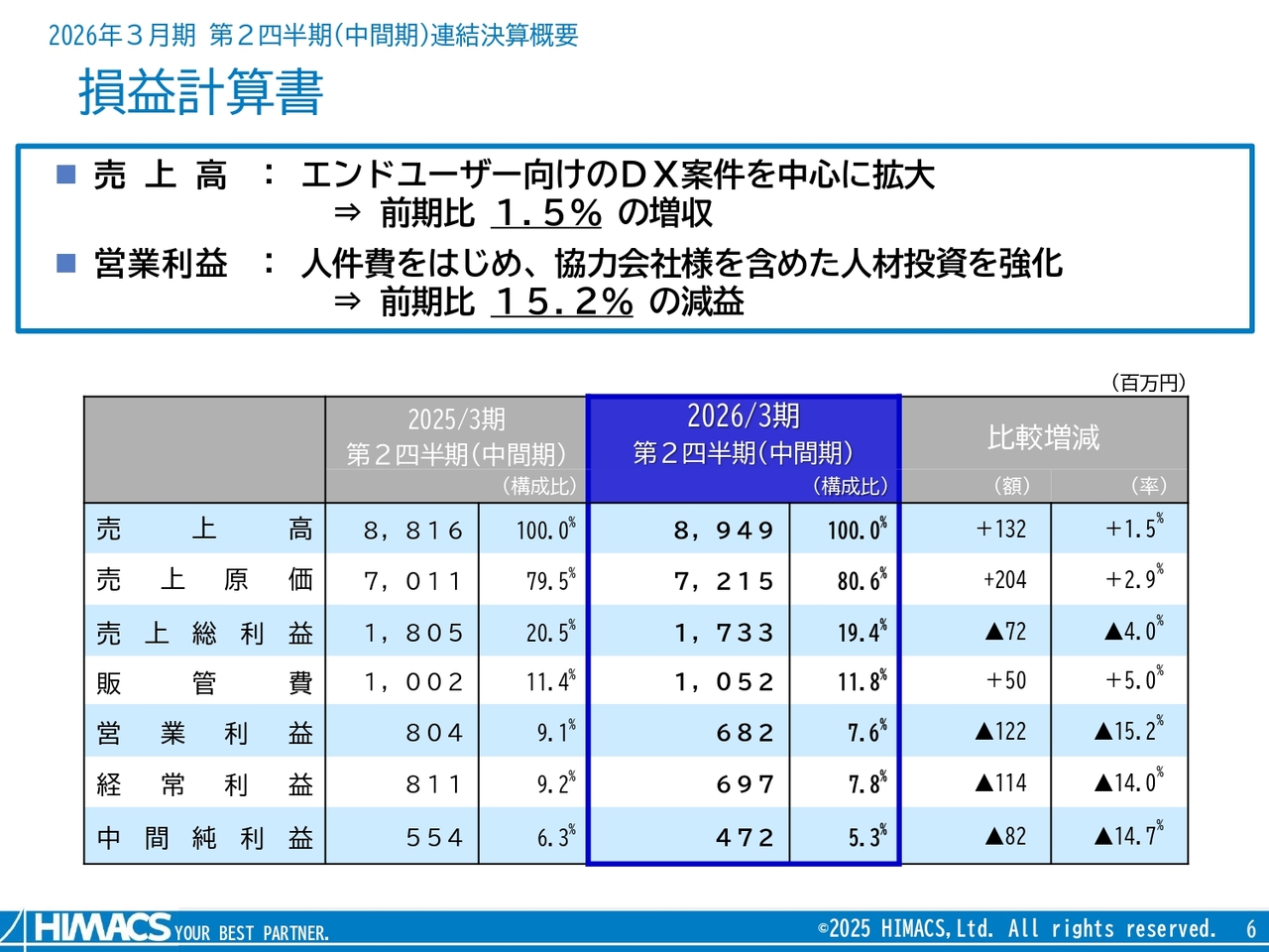 以上で、株式会社ハイマックスの2026年3月期第2四半期決算のご説明を終了します。ご清聴ありがとうございました。