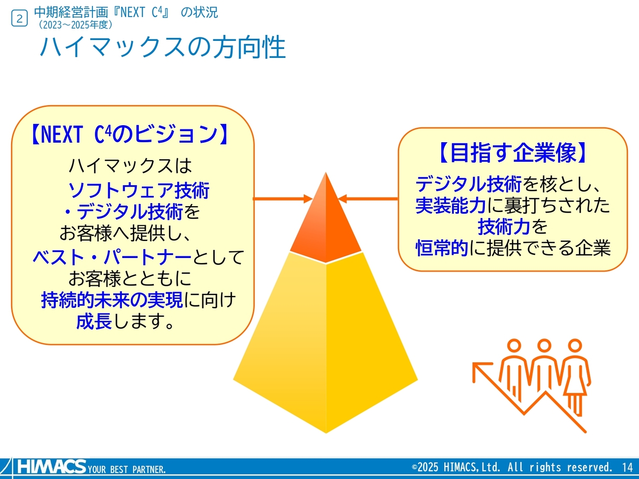 中期経営計画「NEXT C4」の概要です。当社が目指す方向性や企業像については、デジタル技術を核とし、実装能力に裏打ちされた技術力を恒常的に提供できる企業となることを目標としています。ベストパートナーとしてお客さまとともに持続可能な未来の実現に向けて成長していきます。