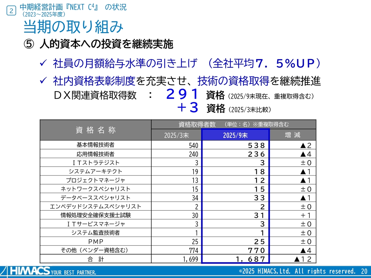 人的資本への投資状況についてご説明します。2025年4月より社員の月額給与水準を全社平均で7.5パーセント引き上げました。