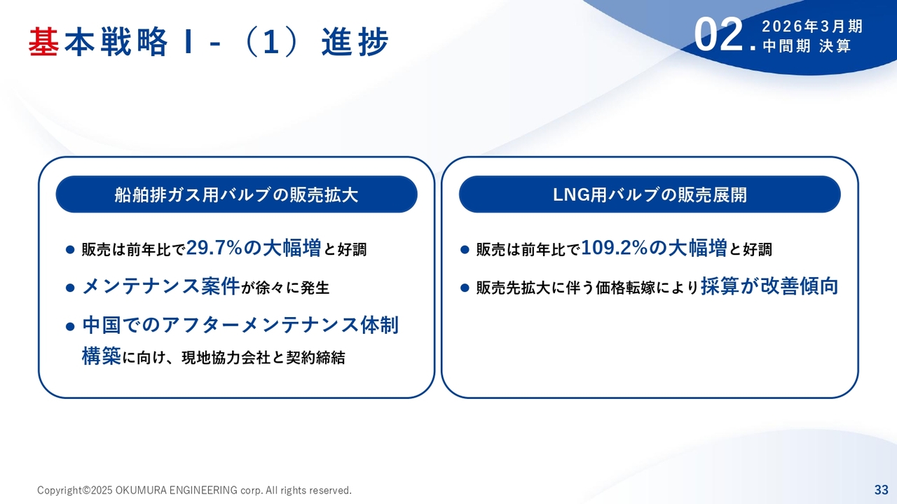 現在の進捗ですが、船舶排ガス用バルブは売上高が前年比29.7パーセント増と好調に推移しています。過去に納入した排ガス用バルブのメンテナンス案件も増えており、こちらも確実に取り込んでいきます。