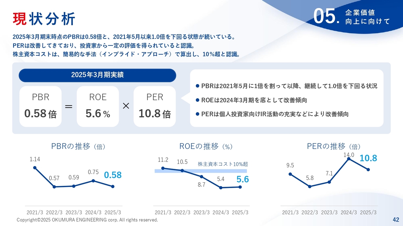 まず現状分析ですが、PBRは2021年5月に1倍を割り込んで以降、継続して1倍を下回っています。ROEも2021年3月期の11.2パーセントをピークに低下し、2025年3月期に若干の改善が見られたものの、依然として課題が残っていると認識しています。