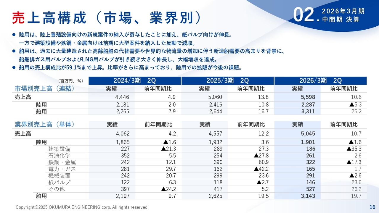 市場・業界別の売上高構成です。陸用と船用の売上構成比では、船用が59パーセントとなり、前年同期比で7ポイント増加しました。船用においては、単体での伸長に加え、今期より中国の船用エンジンメーカー向け販売が寄与しています。