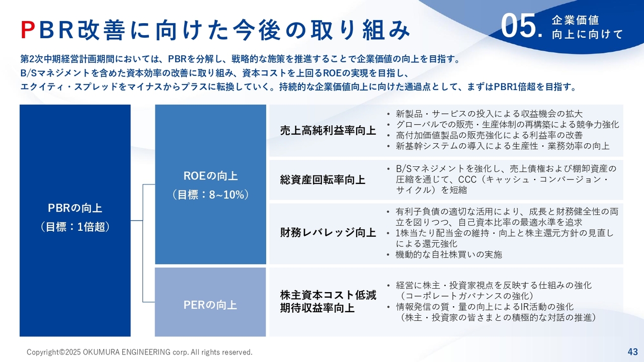 PBR改善に向けた今後の取り組みとしては、ROEの向上、PERの向上を図っていきます。新製品やサービス、高付加価値製品の販売強化などを通じて利益率の向上を実現し、あわせてバランスシートの見直しや施策の実行により、資本効率の改善にも努めていきます。さらに、IR活動の改善にも積極的に取り組み、投資家のみなさまへの情報発信を強化していきます。