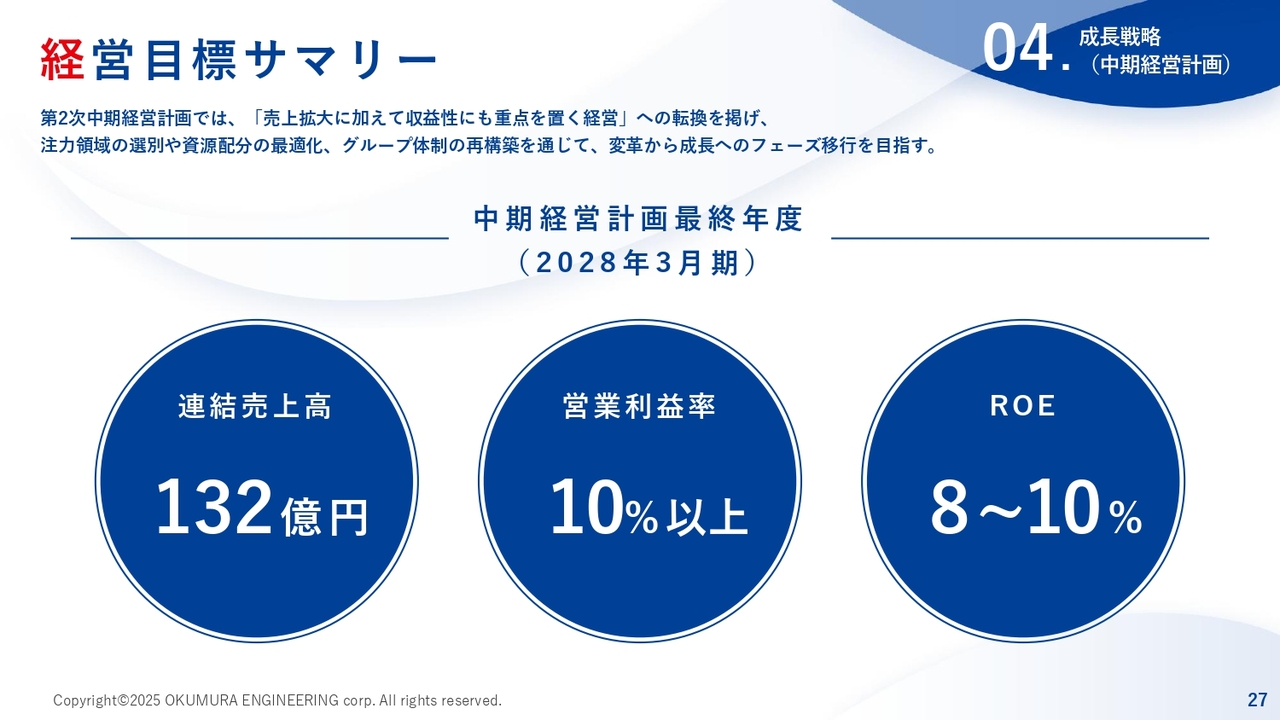 まず、成長戦略および中期経営計画の目標値についてサマリーをお示しします。最終年度となる2028年3月期には、連結売上高132億円、営業利益率10パーセント以上、ROE8パーセントから10パーセントの達成を目指していきます。