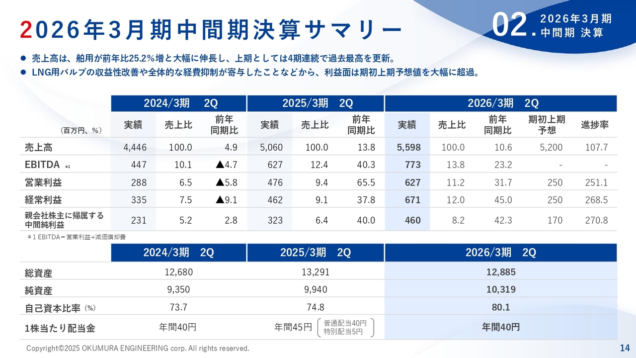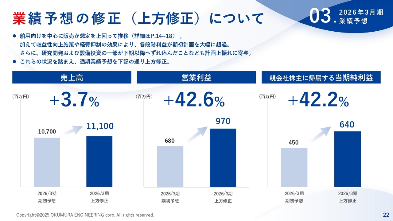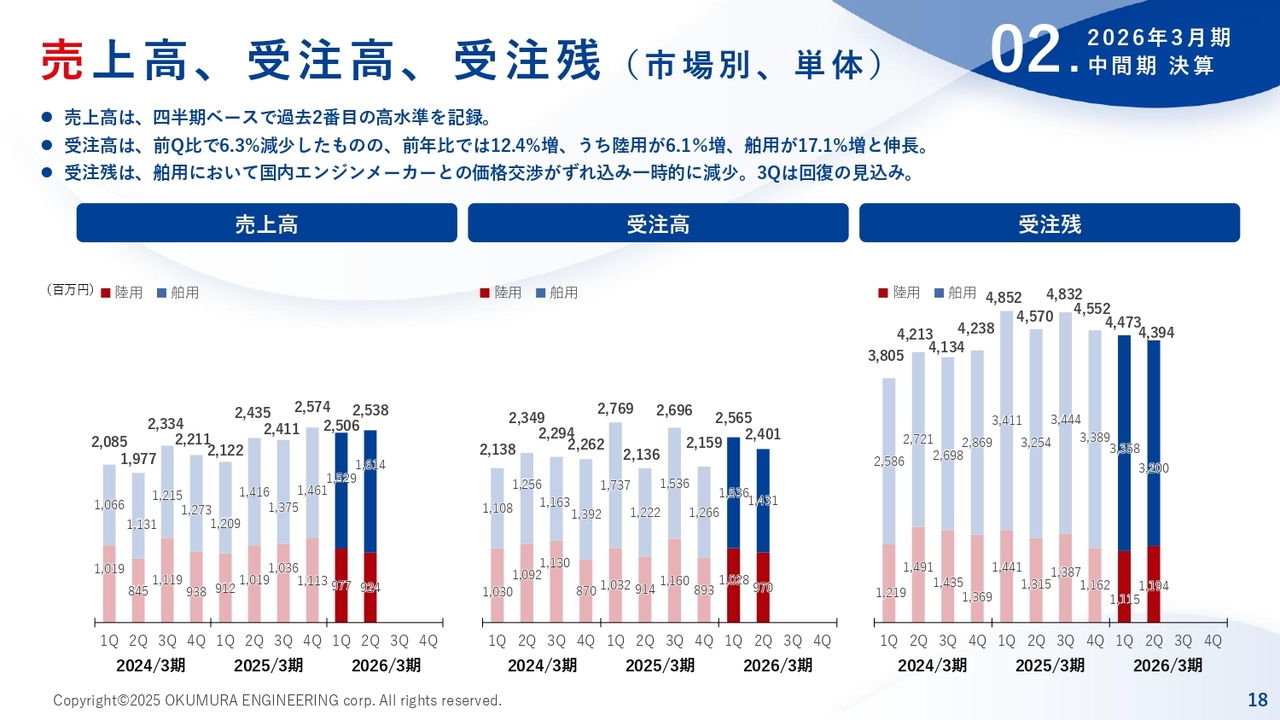 しかし、船用向け販売が堅調に推移し、海外・日本向けの販売も順調に進捗しています。原材料価格の高止まりや為替影響、人材採用費の増加などの懸念材料はあるものの、販売価格の改定や経費抑制の効果が表れ、中間期では期初予想を上回る結果となりました。