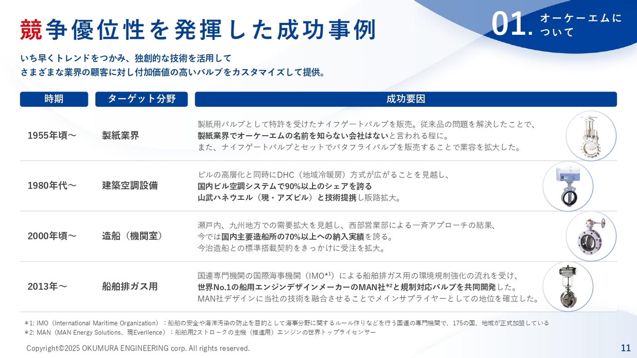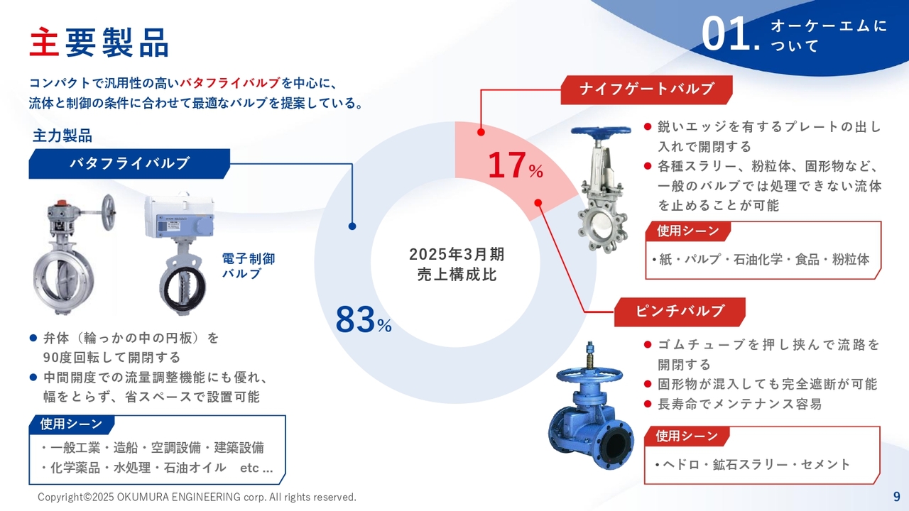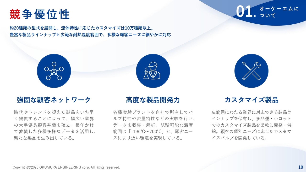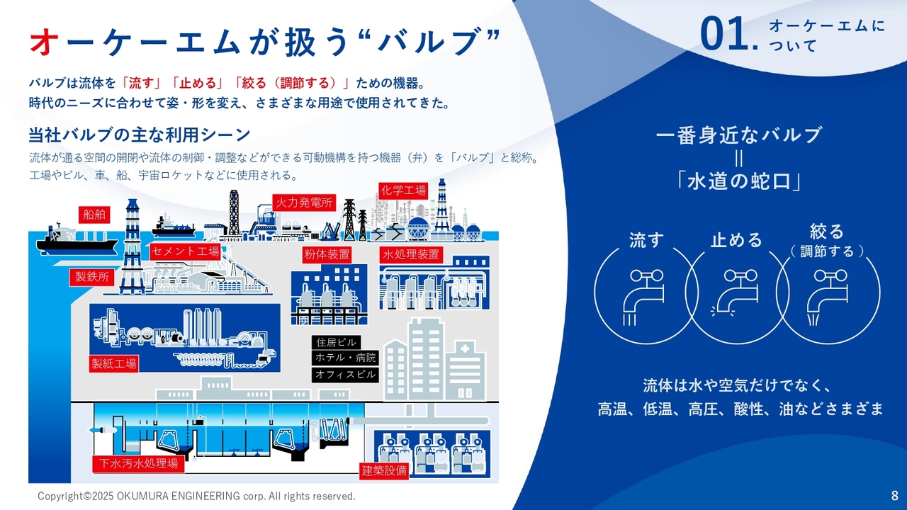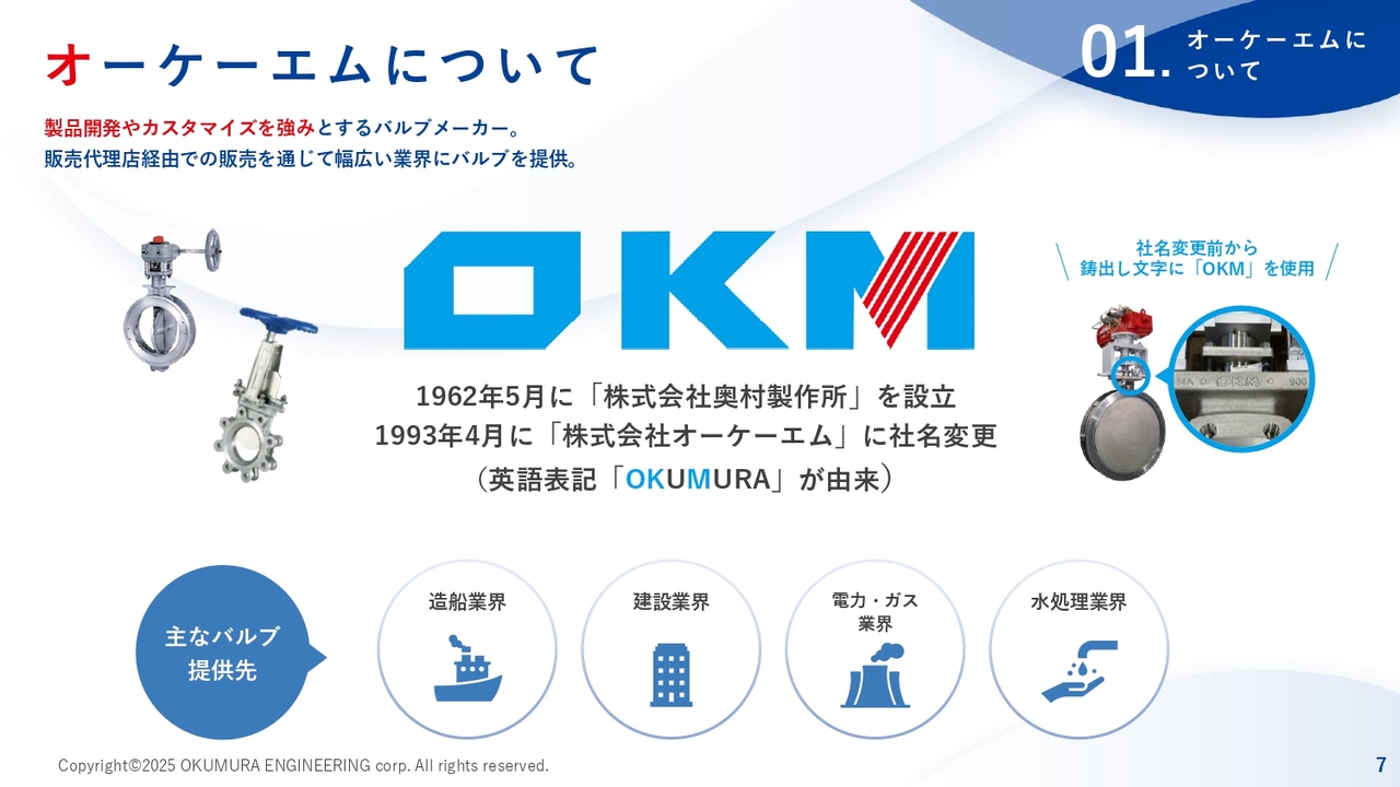 オーケーエムについて簡単にご説明します。当社は工業用バルブの製品開発を行っており、標準製品に加えて、カスタマイズを強みとするバルブメーカーです。
