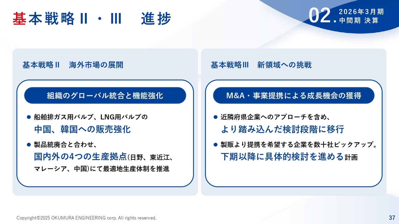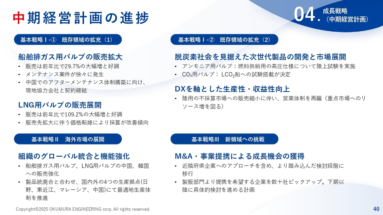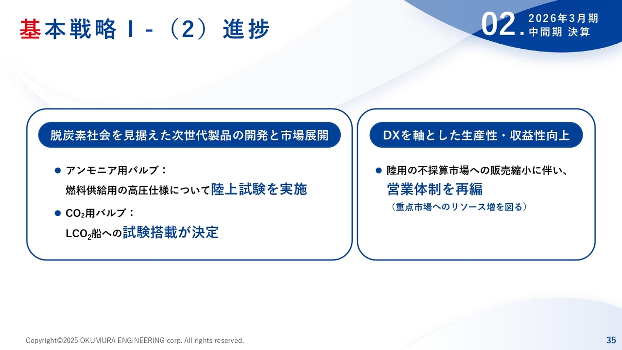 進捗状況についてお伝えします。船舶排ガス用バルブにおいては、中国での販路開拓に取り組んでおり、韓国では釜山にある当社拠点からきめ細かいサポートを行うことで、継続受注を確保しています。LNG用バルブについても、ラインナップ拡充と販路拡大に向け、海外市場でのマーケティング活動を展開しています。