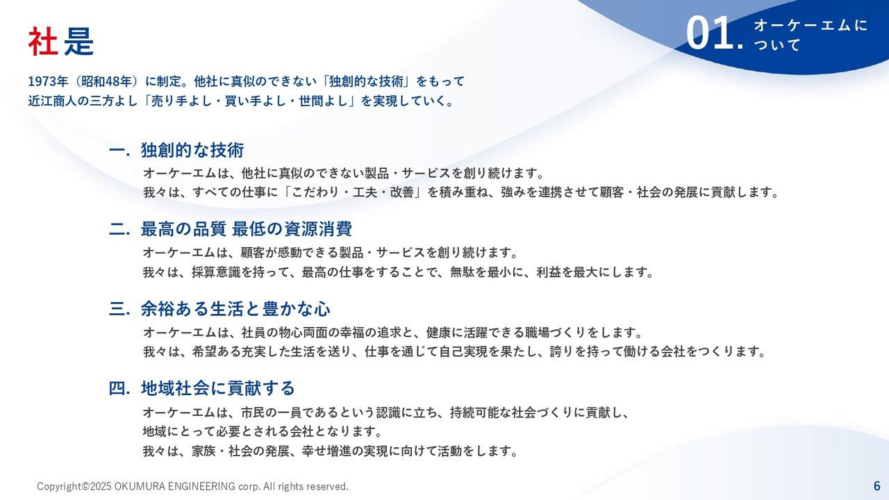 1つ目の独創的な技術を活かし、2つ目から4つ目までを実現する、いわば「三方よし」を目指した社是となっています。