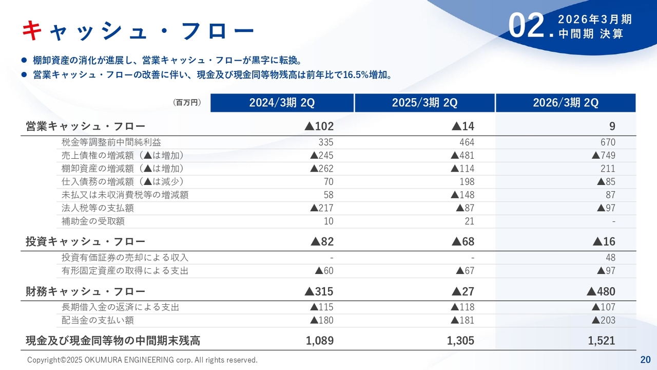 財務活動によるキャッシュ・フローは4億8,000万円の支出となりました。現金及び現金同等物の中間期末残高は15億2,100万円となり、営業キャッシュ・フローの改善もあり、前年同期と比較して16.5パーセント増加しています。
