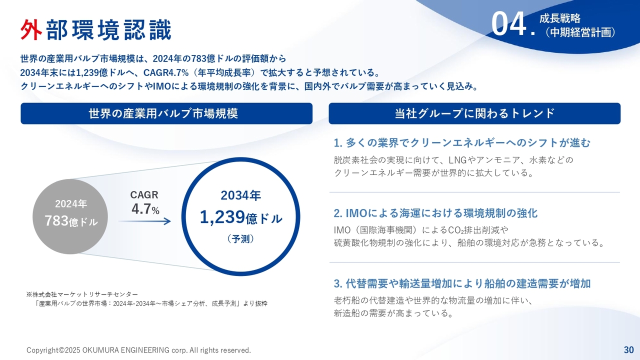 オーケーエムを取り巻く外部環境についてお示ししています。まず、世界のバルブ市場は、2024年から2034年にかけて年平均成長率4.7パーセントで推移すると言われています。世界的にクリーンエネルギーへのシフトが進んでおり、燃料としてのアンモニアや水素の需要が高まっていきます。足元では一部で需要の足踏みも見られますが、長期的にはクリーンエネルギーへの移行が確実に進むと見ています。