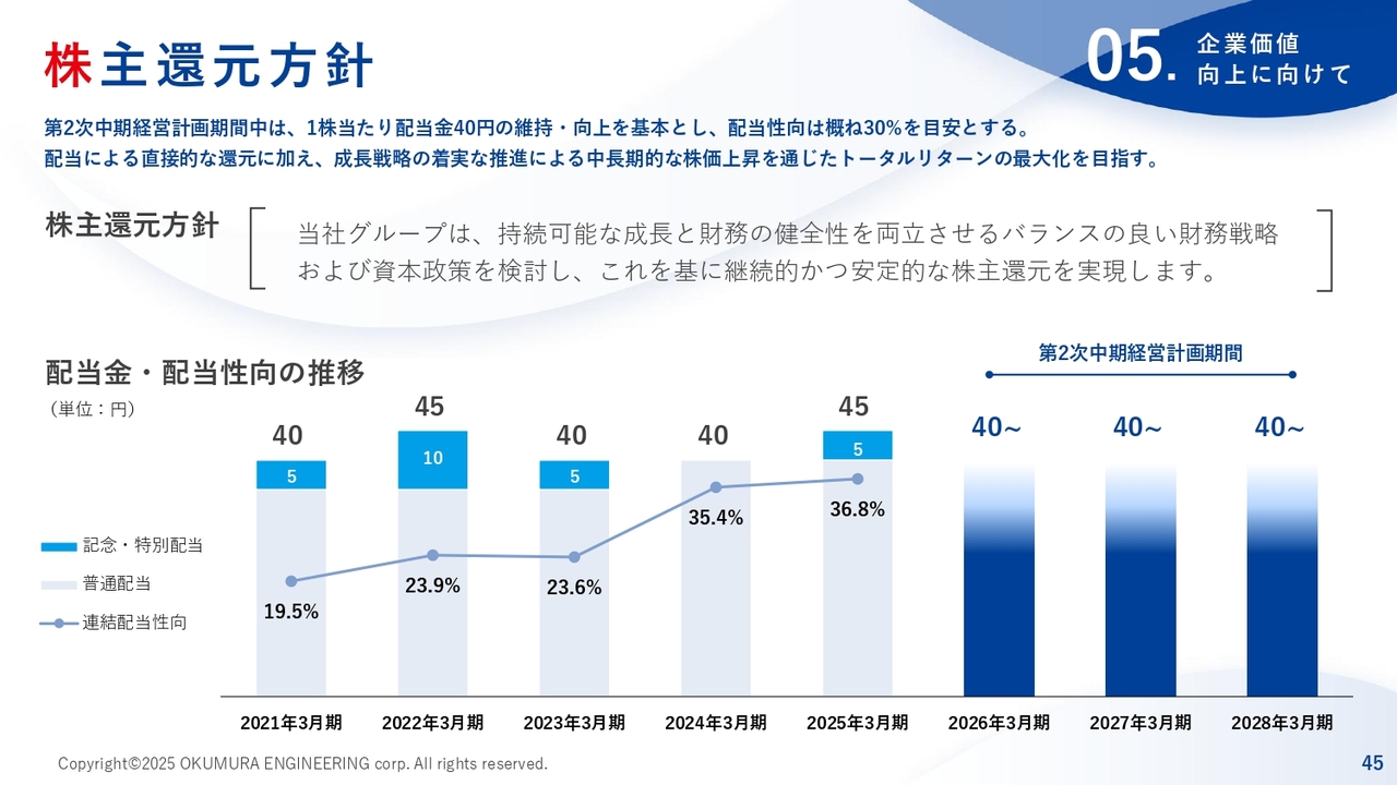 続いて、株主還元方針です。持続的な成長のため、研究開発や設備投資を充実させつつ、財務バランスを考慮しながら、継続性・安定性に配慮した還元を行っていきたいと考えています。本中期経営計画においては、40円の配当をベースとし、さらなる向上を目指して安定的な配当を継続していきます。