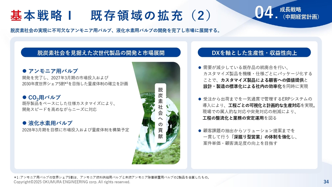 基本戦略2、海外市場への展開です。国内外の攻略市場に向け、グループ全体で販売体制を強化していきます。各国の顧客ニーズに合わせたカスタマイズ製品、たとえば排ガス用バルブやLNG用バルブなど、脱炭素に関わる製品を生産・供給することで、顧客満足度の向上を図っていきます。