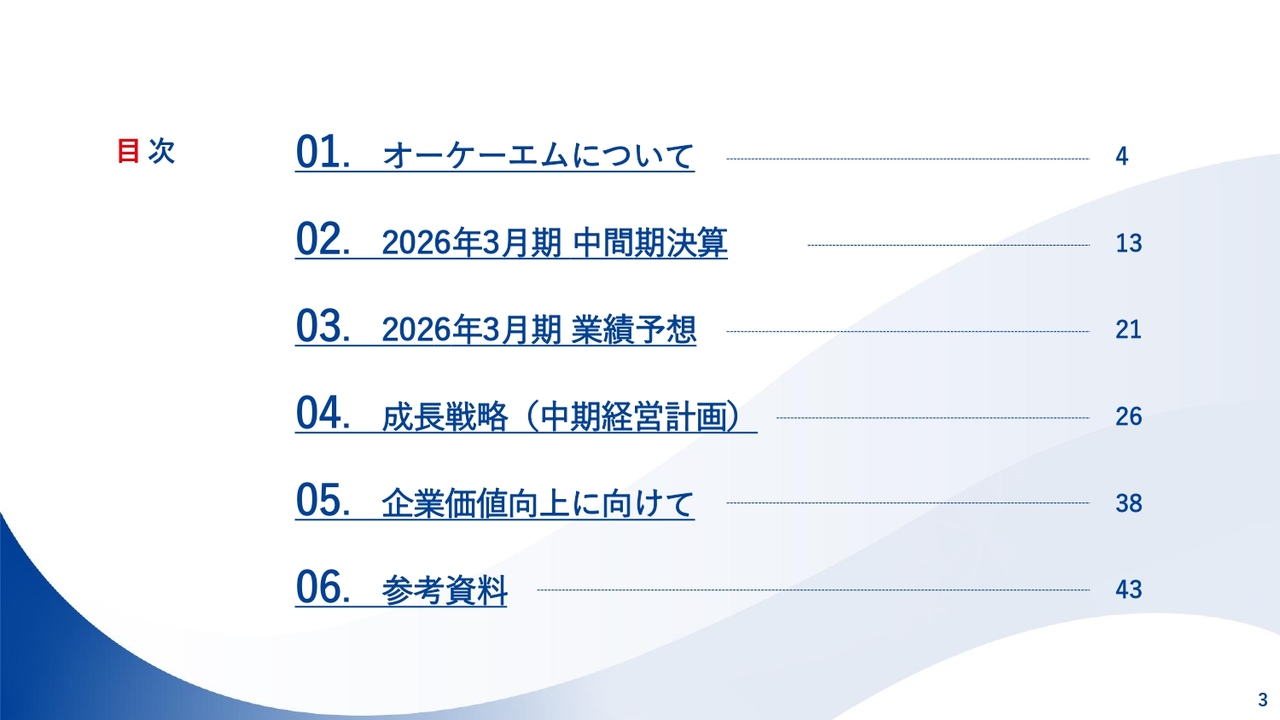 奥村晋一氏(以下、奥村):みなさま、こんにちは。株式会社オーケーエム代表取締役社長の奥村晋一です。本日は、2026年3月期の中間決算についてご説明します。