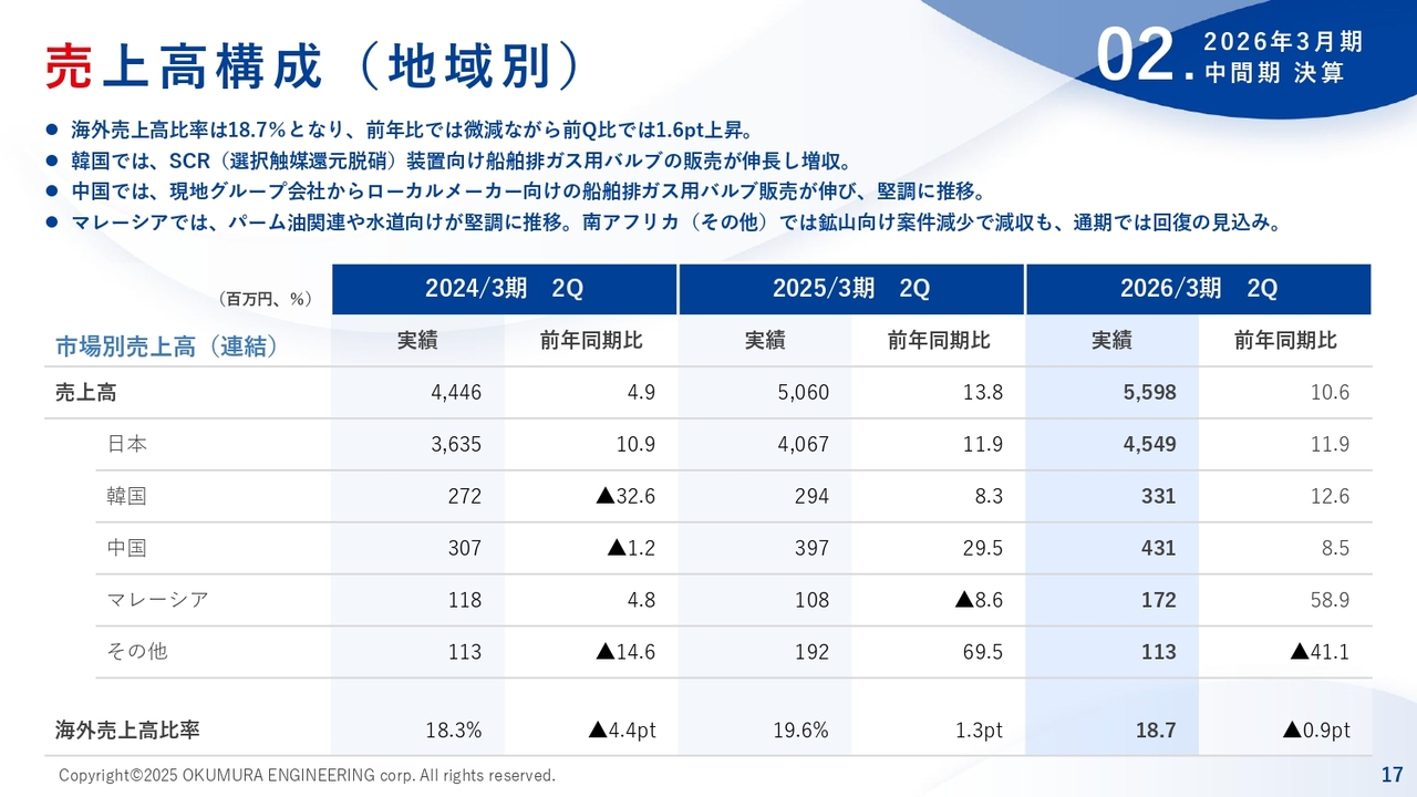 次に、地域別売上構成についてご説明します。日本では船用向けの堅調な伸長が見られ、韓国では船舶排ガス用バルブの販売が増加しています。中国では、機械装置工場向けをはじめ全体的に市場が低迷しているものの、半導体工場向け水処理案件の継続や、船舶排ガス用バルブの新規販売の増加が寄与しました。マレーシアでは、パーム油関連や上水道案件の安定した販売により、前年同期比で伸長しています。