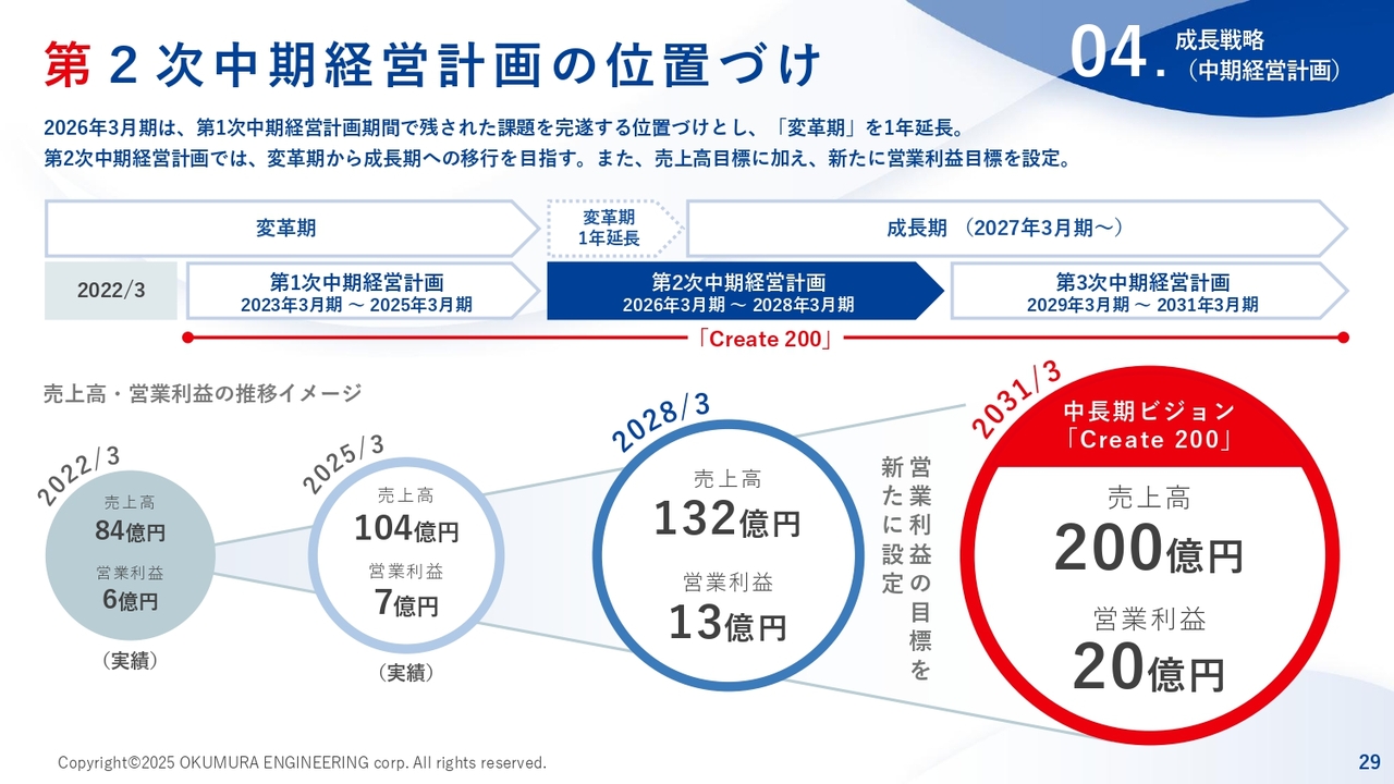 続いて、第2次中期経営計画の位置付けをお示ししています。中長期ビジョン「Create 200」について、1次中計では売上高200億円のみを設定していましたが、今回の第2次中計からは、売上高200億円に加え、営業利益20億円という収益面の目標も追加しています。売上拡大だけでなく、より収益性に重点を置いた展開を進めていきます。
