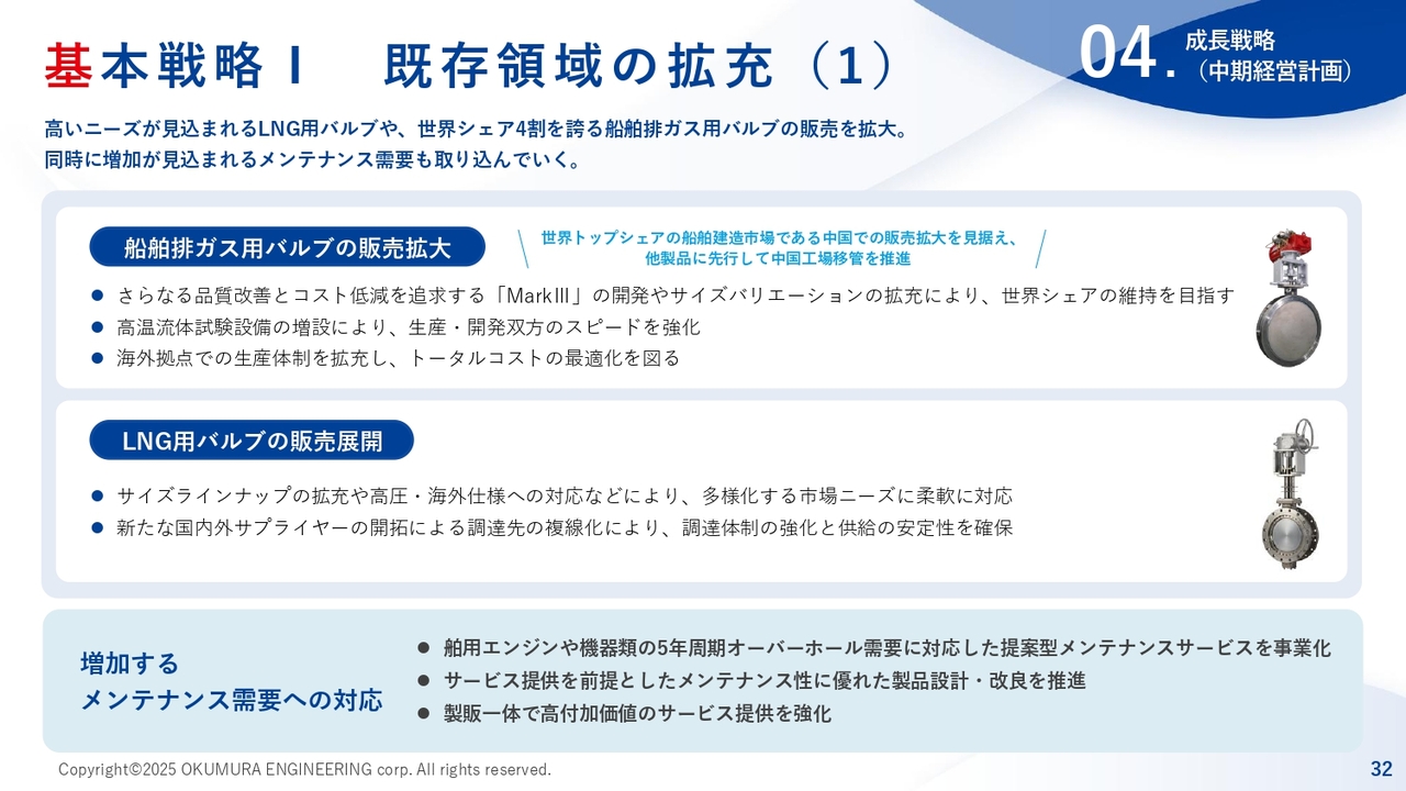 まず、基本戦略1である既存領域の拡充です。特に、船舶排ガス用バルブの販売拡大を進めていきます。本製品については、第3弾となる改良製品「MarkIII」を開発し、より高い品質の安定化とコスト低減を実現した上で市場投入していきます。