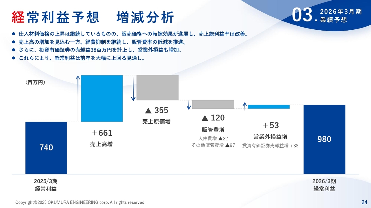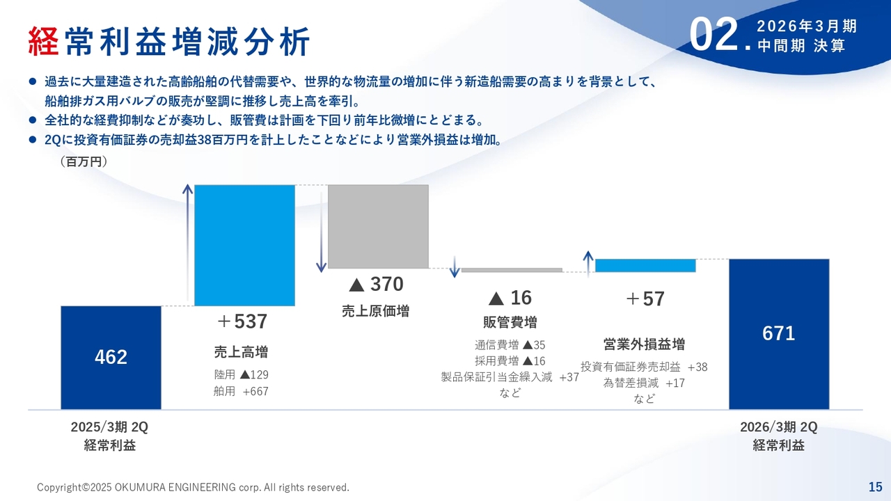 続いて、経常利益の増減要因についてご説明します。売上高については、陸用向けが前年度に建築設備業界や製鉄所向けの大型案件があった反動もあり、今期は減少しました。一方で、新造船向けおよび船舶排ガス用バルブの堅調な販売により、船用が大きく伸長しています。