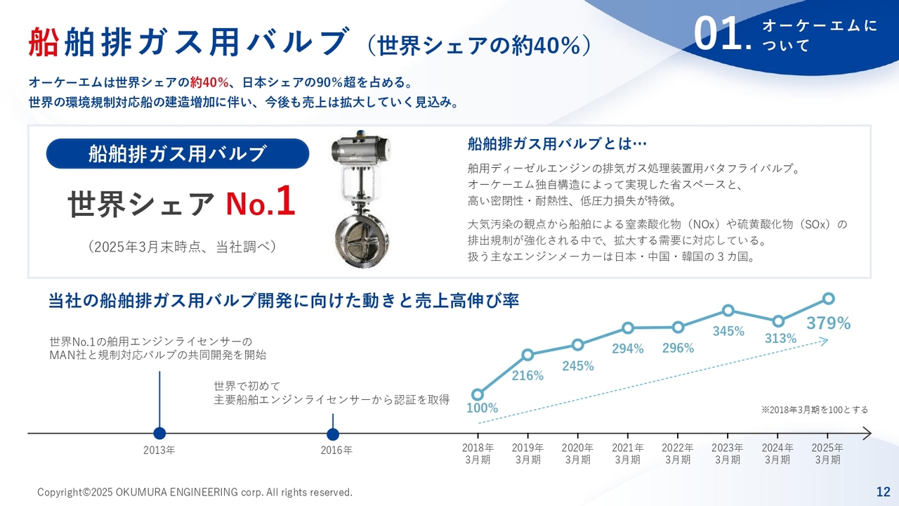 近年では、船舶排ガス用バルブが業績に寄与しています。大型船舶のエンジンに使われるバルブで、エンジンから排出される排気ガスから窒素酸化物(NOx)を除去する装置とエンジンをつなぐ配管に設置されるものです。2018年の投入以来、着実に売上を伸ばしています。
