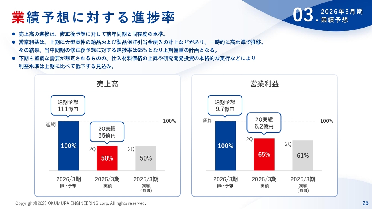 売上高の進捗については、中間期も計画どおり積み上がっており、下期においても前年同期と同水準で進むものと見ています。営業利益の進捗率は中間期で65パーセントとなっていますが、下期は基幹システム投資や研究開発投資の本格実施により、上期と比較すると利益水準は低下すると予想しています。