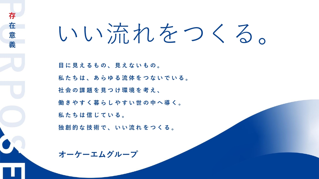 まず、第1章「オーケーエムについて」です。当社のパーパスは「いい流れをつくる。」です。この言葉には、3つの思いを込めています。