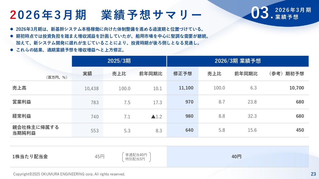 現時点での下期の状況を踏まえ、2026年3月期通期業績見通しを上方修正します。売上高は111億円、営業利益9億7,000万円、経常利益9億8,000万円、親会社株主に帰属する当期純利益は6億4,000万円、1株当たり配当金は40円を予想しています。