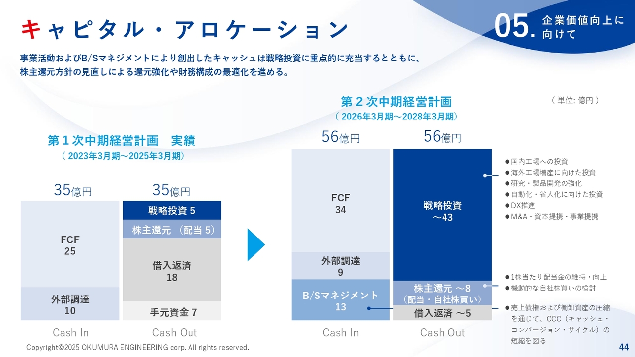 資本配分の見直しです。事業活動で生み出すキャッシュの増加はもちろん、売上債権や棚卸資産の圧縮などにより、キャッシュインの改善を図っていきます。生み出したキャッシュは積極的に投資へと配分し、成長の加速につなげていきます。