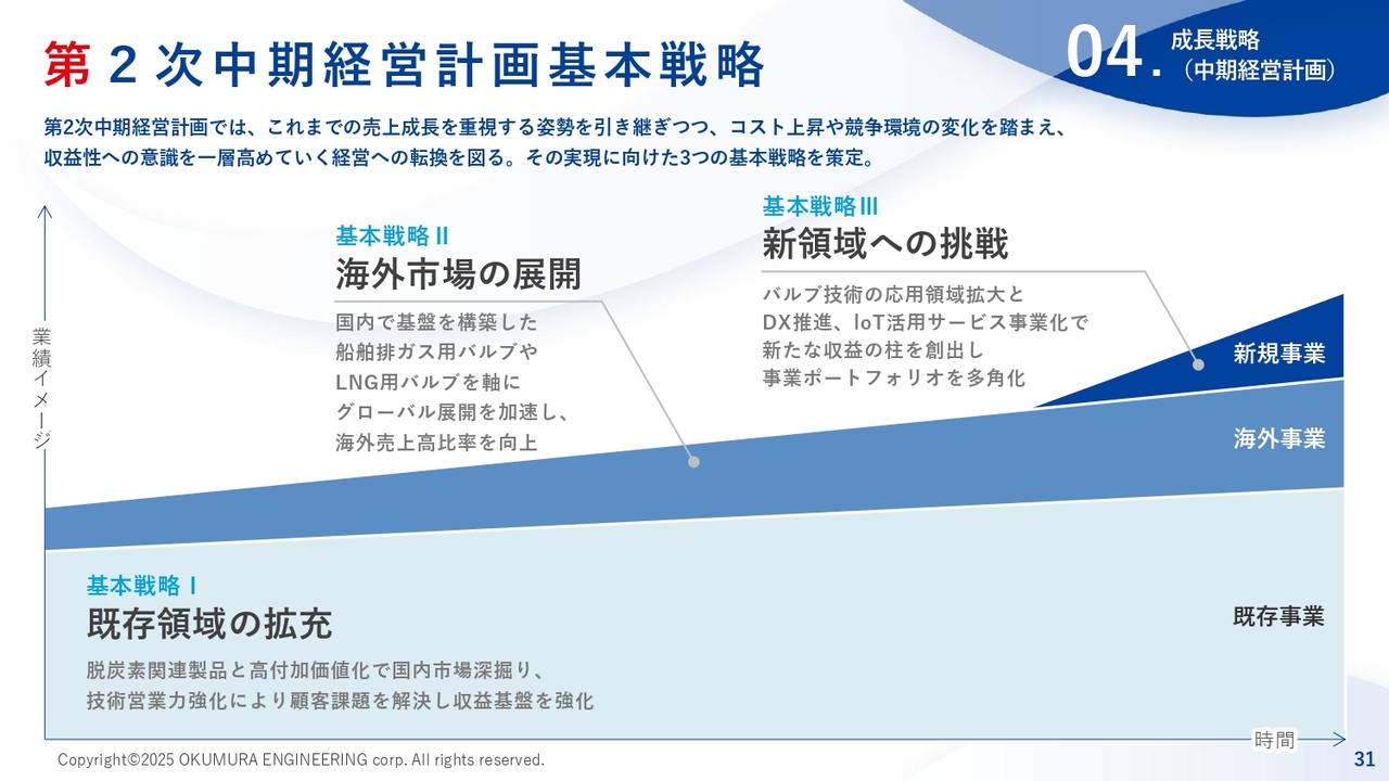 第2次中期経営計画の基本戦略は3つです。1つ目が既存領域の拡充、2つ目が海外市場への展開、3つ目が新領域への挑戦です。