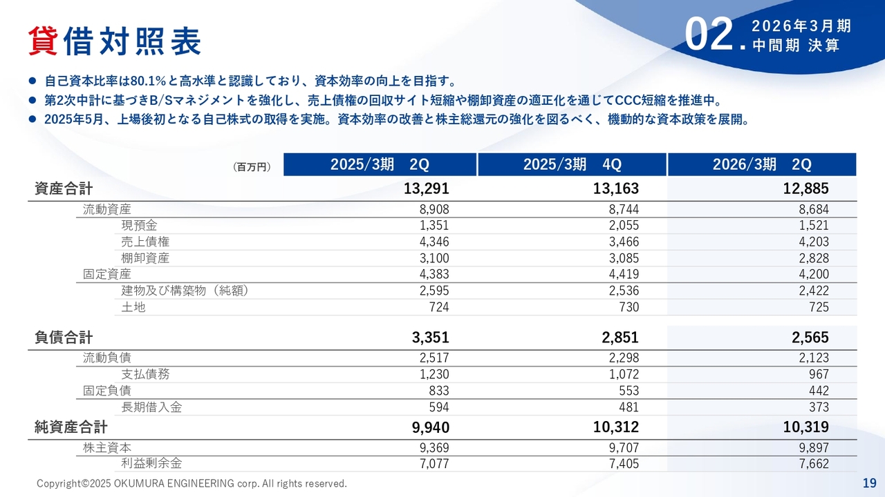 主な変動要因は、現金・預金の減少、電子記録債権の増加、長期借入金の減少です。自己資本比率は80.1パーセントと高い水準を維持しており、引き続き資本効率の向上を目指していきます。