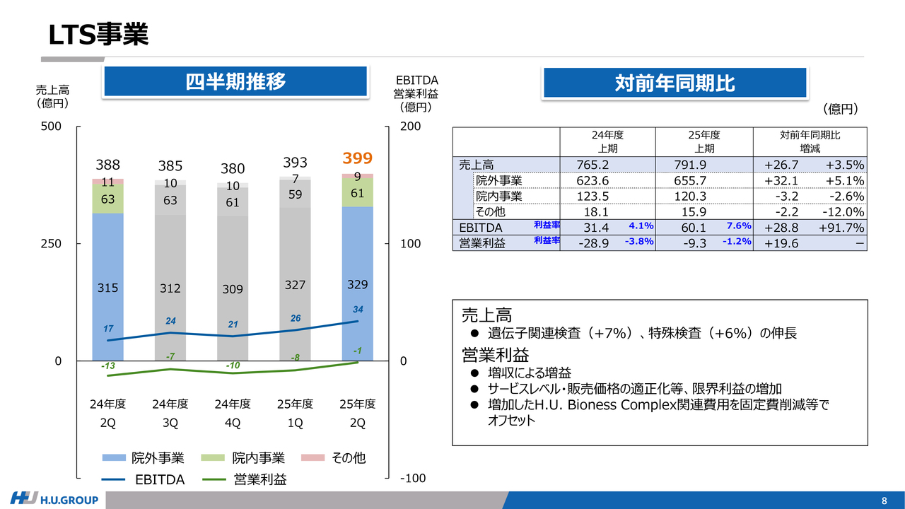セグメントごとの説明に移ります。まずはLTS事業についてです。売上高は、遺伝子関連検査および特殊検査を中心に伸びており、成長を遂げています。