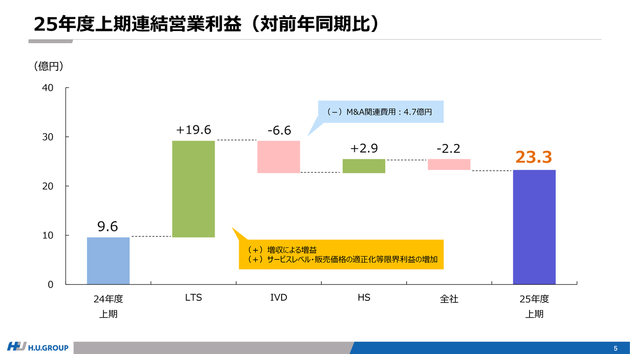 HS事業は増収および価格の適正化により増益となりました。これらの結果、全体の営業利益は23億3,000万円となっています。