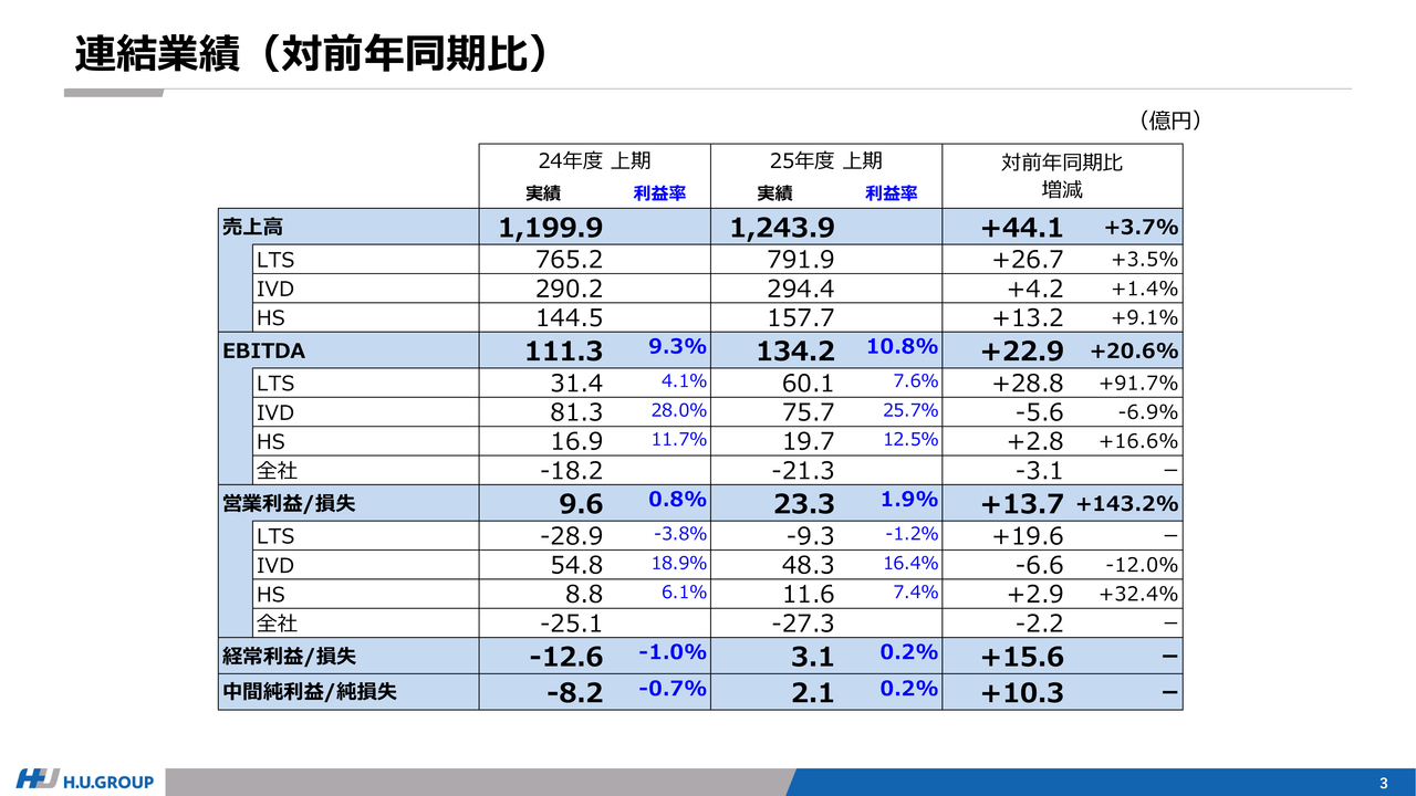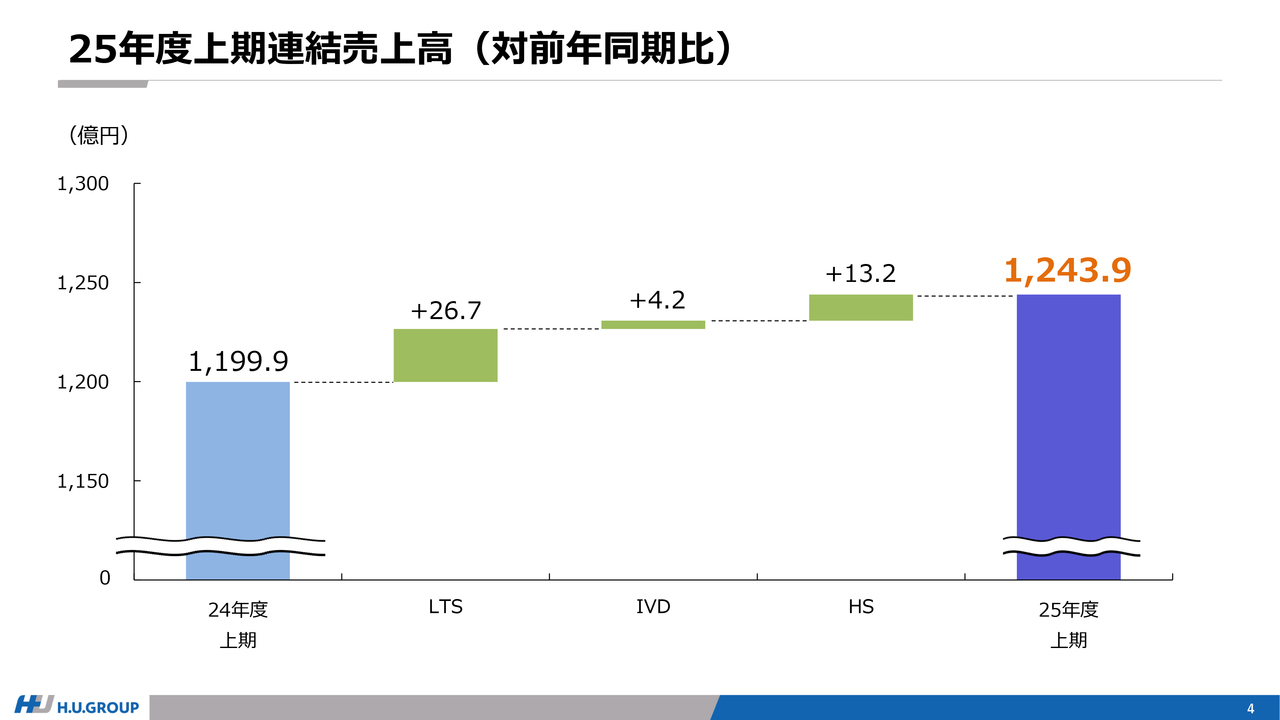 スライドは、売上高の対前年同期比を示しています。約44億円の増収の内訳は、LTS事業でサービスレベルや販売価格の適正化を含む施策、遺伝子関連検査や特殊検査の伸長、IVD事業では主にNEURO試薬の需要拡大による販売の伸長、HS事業では滅菌・手術関連が堅調に推移していることなどによるものです。