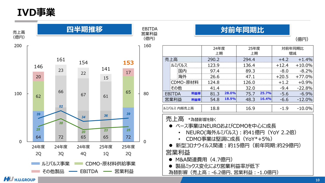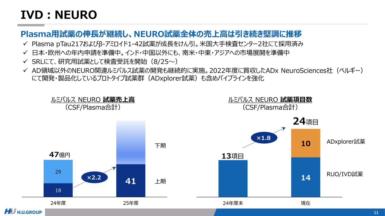 IVD事業に関しては、NEUROは5月のFDA承認取得を追い風に、引き続き高い成長を続けており、NEURO関連売上は約41億円で前年比2.2倍となりました。また、CDMO売上についても、中国市場の影響はあるものの、新規案件による売上貢献などがあり、為替を除いて5パーセント成長と堅調に推移しています。