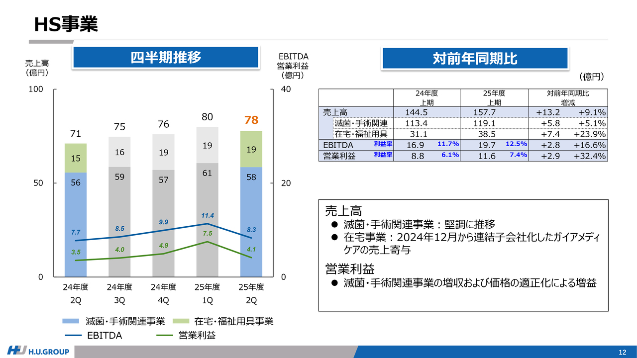 また、在宅事業では2024年12月から連結子会社化しているガイアメディケアの売上が増収に寄与しています。利益面では、滅菌・手術関連事業の増収による増益に加え、価格の適正化も寄与し、増益となりました。
