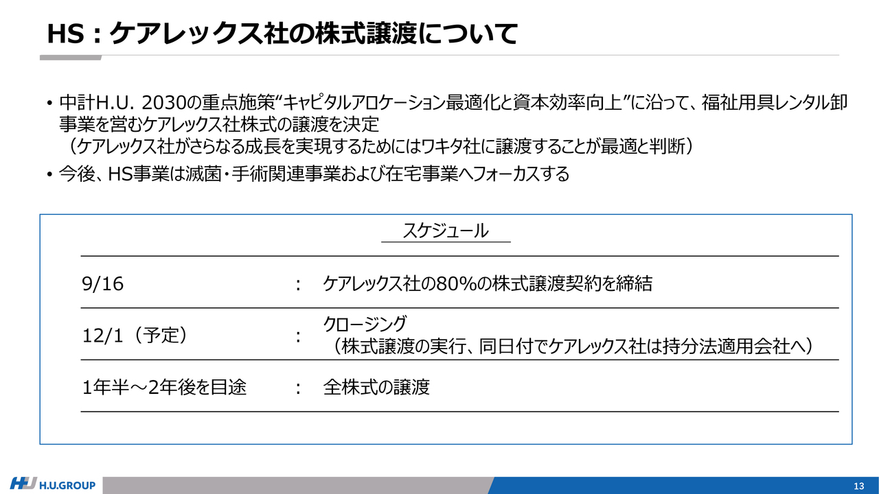 この意思決定により、HS事業は滅菌・手術関連事業および在宅事業にフォーカスしていくことになります。今後のスケジュールとしては、クロージングを12月1日に予定しており、このタイミングでケアレックス社は当社の持分法適用会社となります。その後、1年半から2年後をめどに全株式の譲渡を行う予定です。