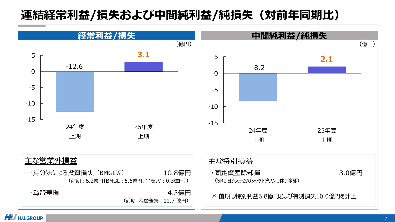 スライドは、経常利益および純利益についてです。まず、スライド左側は経常利益についてです。営業外損益として計上している持分法による投資損失は前期比で増加しました。一方、為替差損のマイナス影響は第1四半期と比較して小さくなりました。