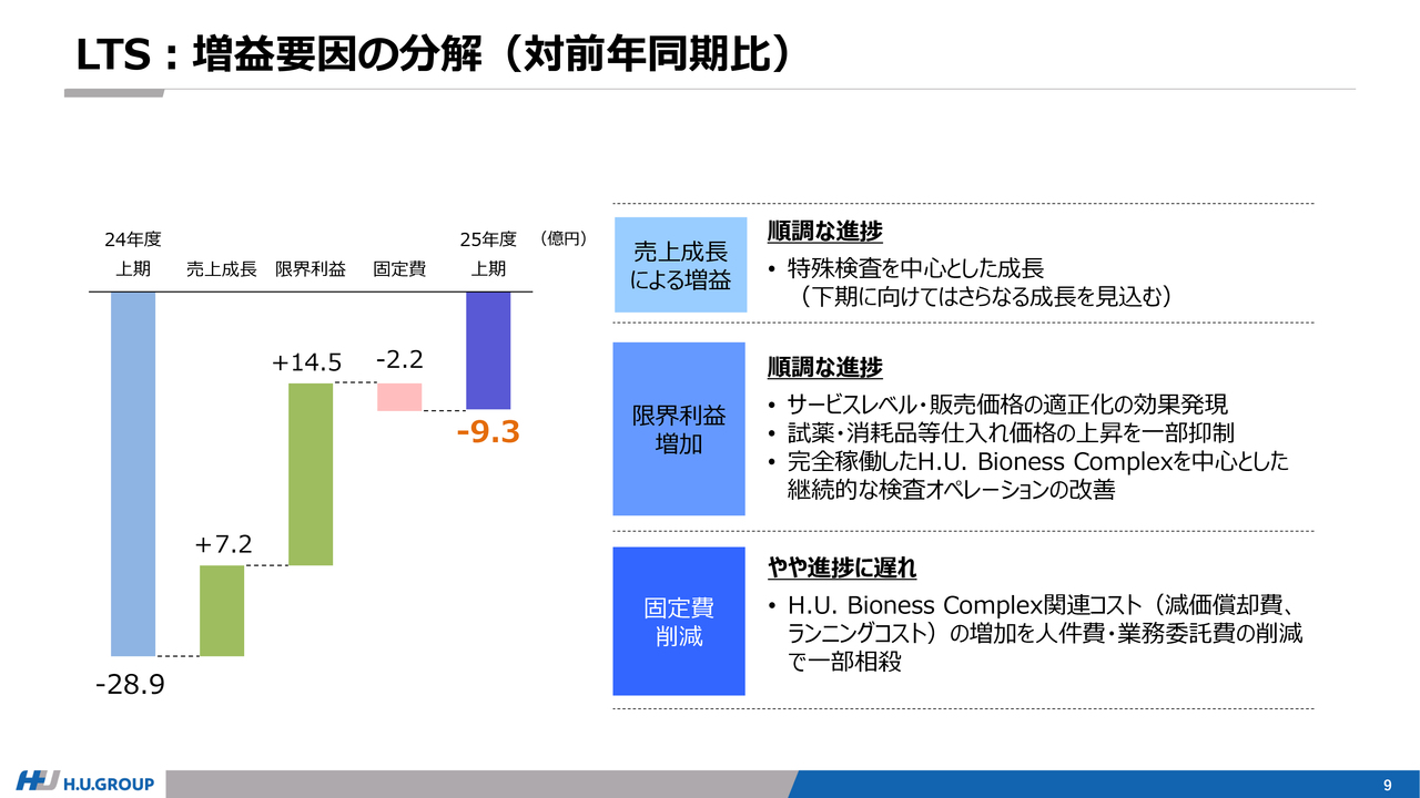 なお、M&A関連費用を除いた実質的な営業利益は約28億円の水準となります。LTS事業に関しては、遺伝子関連検査および特殊検査が引き続き堅調に成長しています。また、サービスレベルや販売価格の適正化を含めた限界利益増加施策の効果により、減価償却費の増加などのコスト増を吸収し、増益になっています。