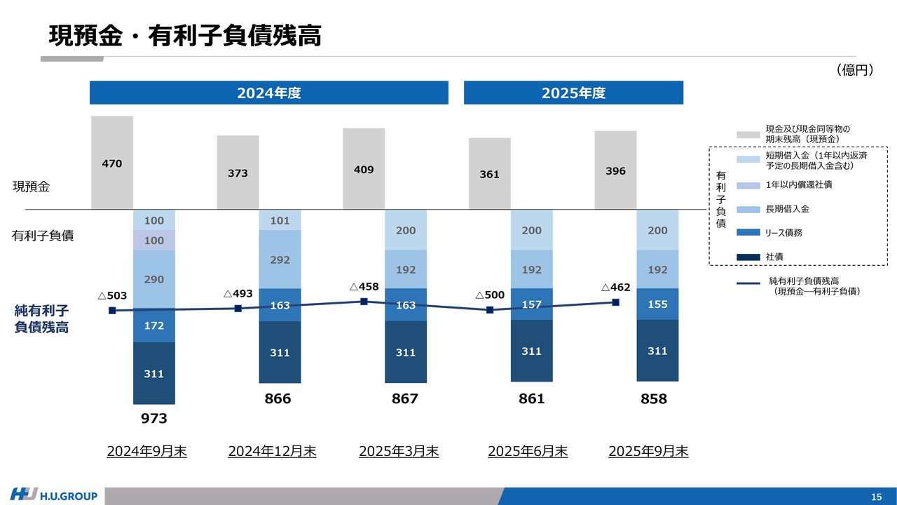スライドは現預金と有利子負債残高に関するデータです。前年同期である2024年9月末および直近の2025年6月末との比較でも、純有利子負債が減少しており、ほぼ期初の計画どおりに推移しています。
