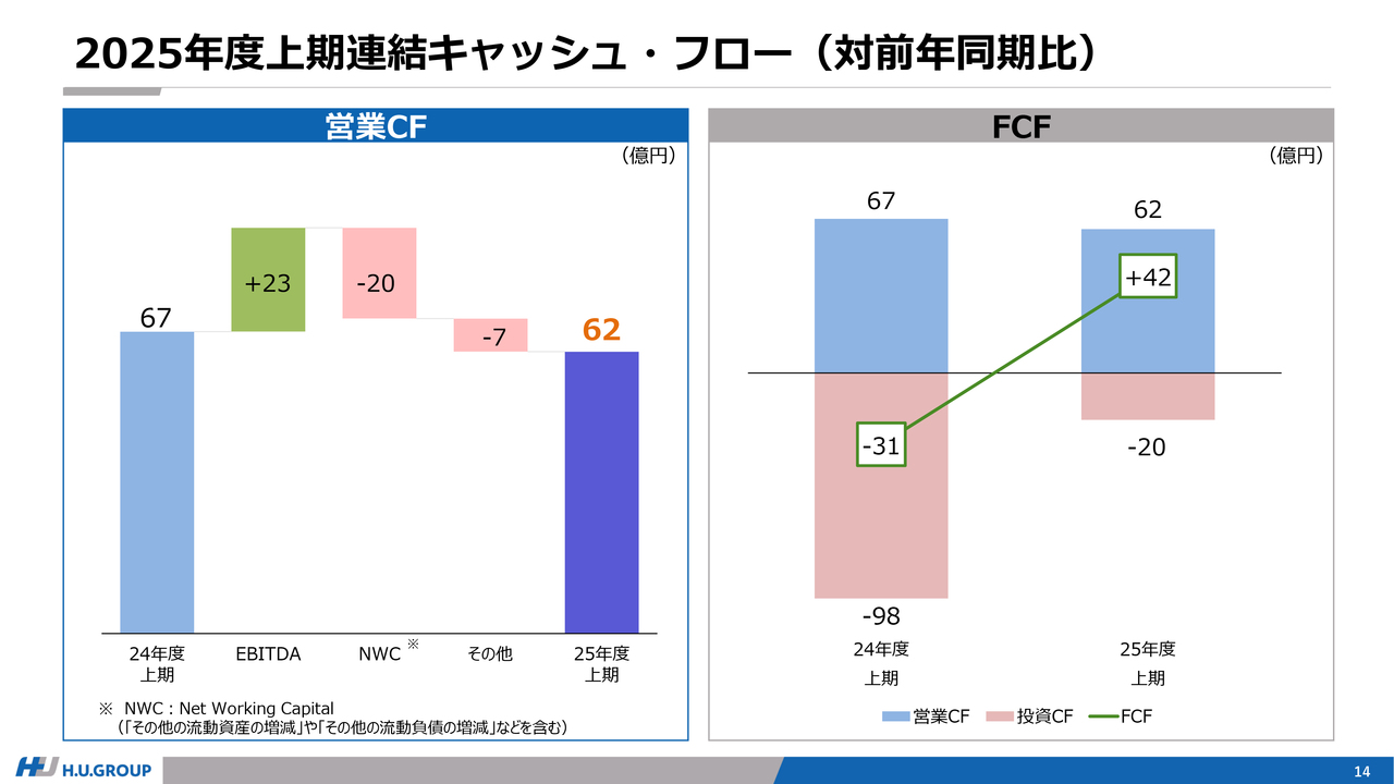 その結果、営業キャッシュ・フローは同水準を維持しつつ、投資キャッシュ・フローを適切にコントロールすることで、フリーキャッシュ・フローは42億円となり、前年同期比で大幅に増加しました。