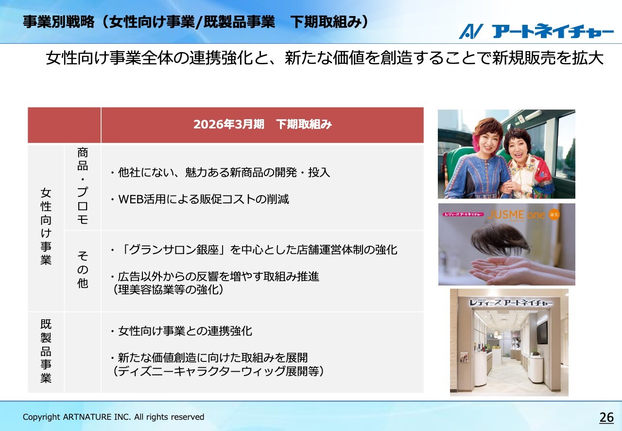 女性向け事業に関しては、オーダーメイドウィッグがやや出遅れましたが、下期の新商品で盛り返しを図っており、手応えをつかんでいます。また、ジュリア・オージェなどに関しても、現時点では順調に推移しています。
