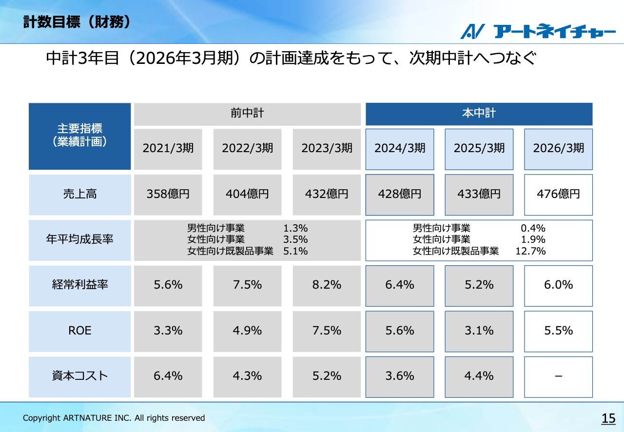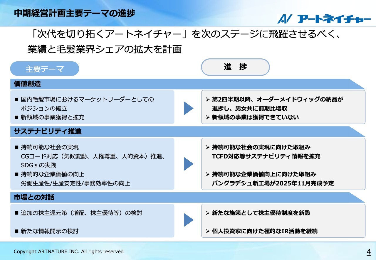 今期は、中期経営計画「アートネイチャー Advance プラン」の3年目、すなわち最終年度にあたります。「価値創造」「サステナビリティ推進」「市場との対話」という3つの主要テーマの進捗を、スライド右側にまとめて記載しています。この後、一つひとつ順を追ってご説明します。