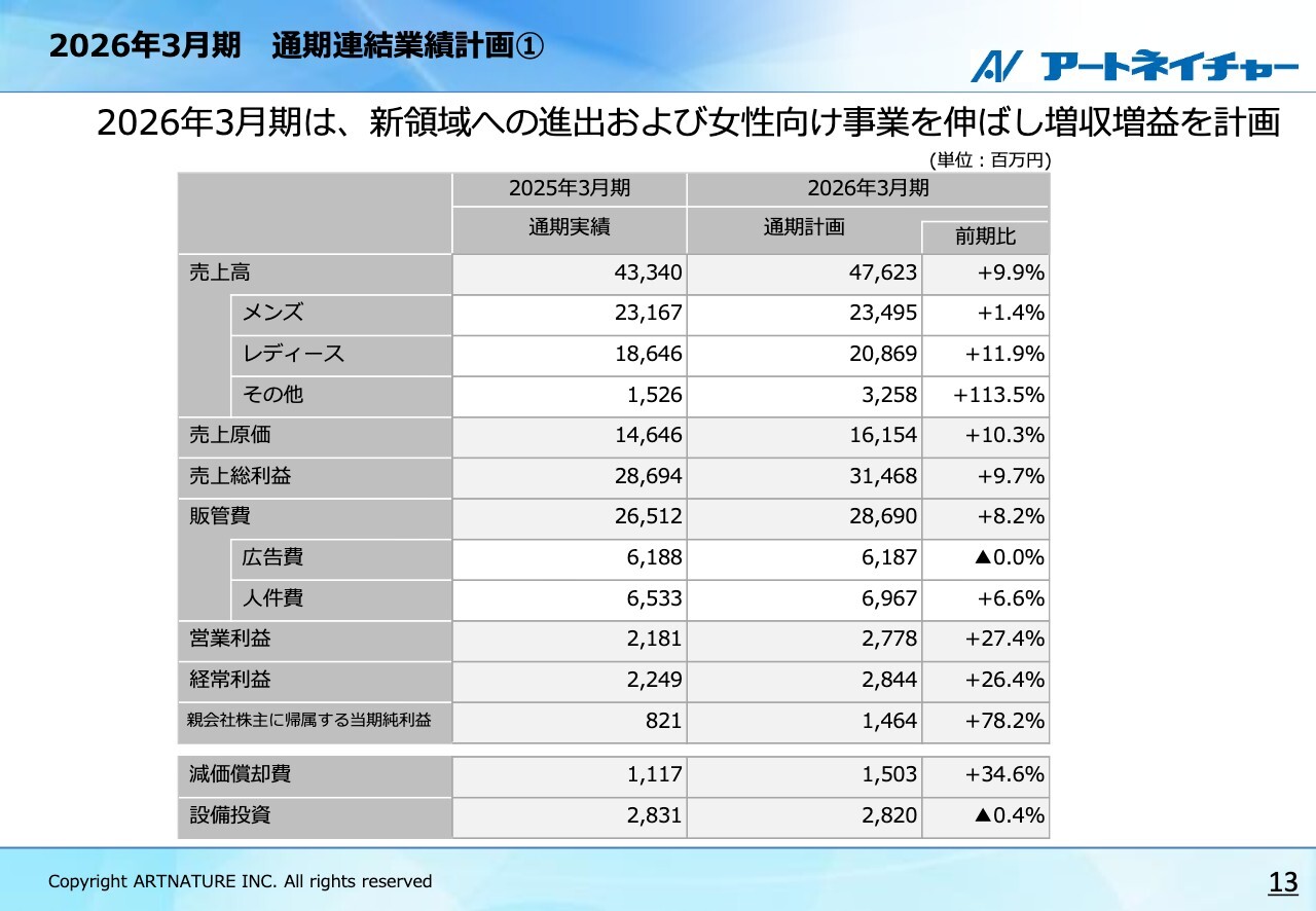 スライドの最上段にはコメントを記載していますが、新領域への進出および女性向け事業に注力し、増収増益を計画しています。