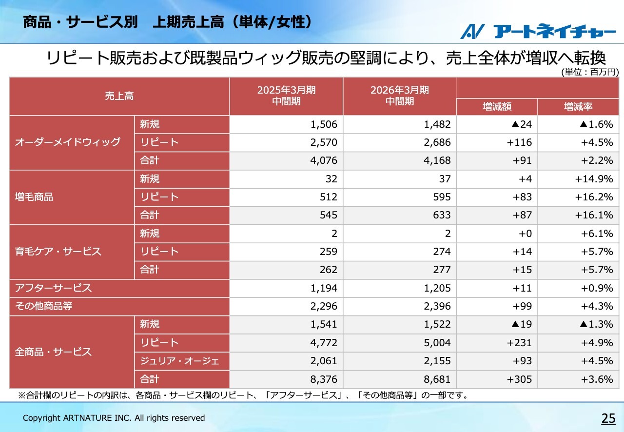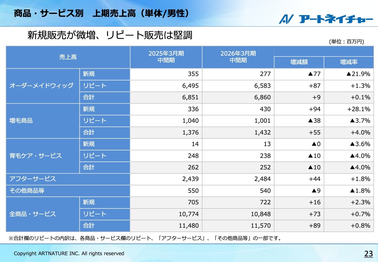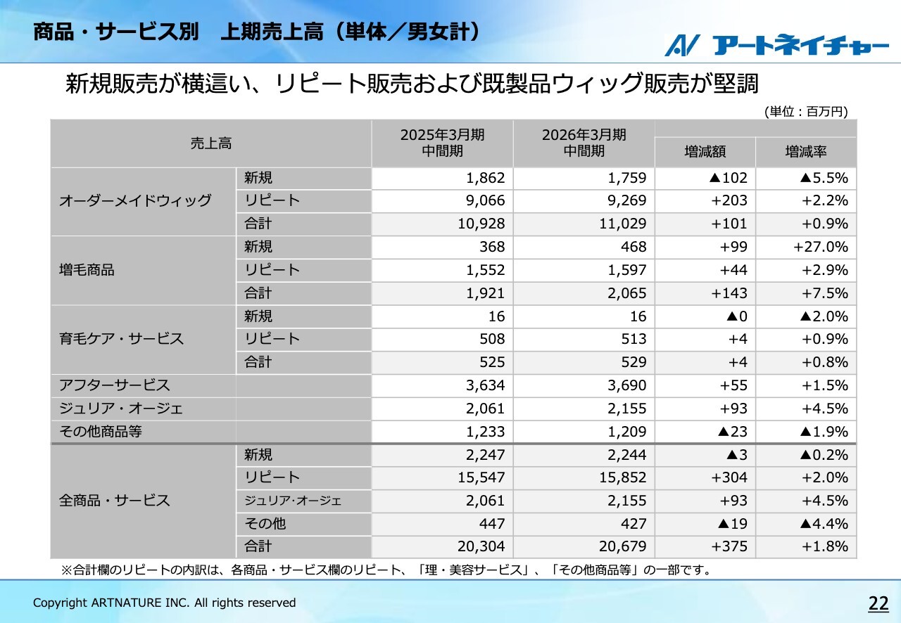 単体および男女計の商品・サービス別上期売上高をご説明します。全体では最下段の全商品・サービス欄にあるとおり、新規売上高はほぼ横ばいでしたが、リピート販売とジュリア・オージェが堅調だったことから、前年同期比プラス1.8パーセントの増収となりました。