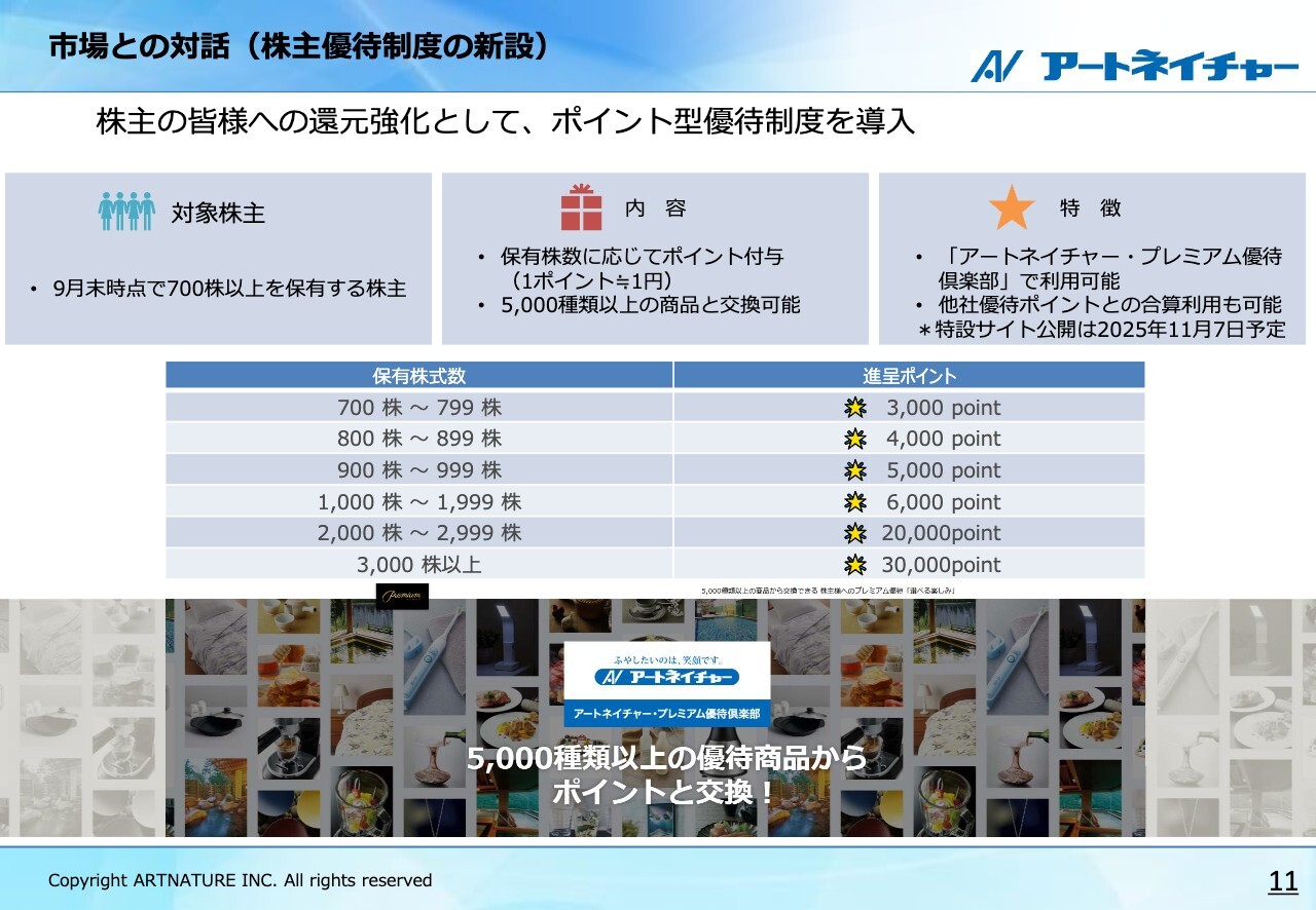 今年度は、追加的な株主還元施策として、個人株主のみなさまから要望の多かった株主優待制度を新設しました。「アートネイチャー・プレミアム優待倶楽部」というポイント型の株主優待です。9月末時点で700株以上をお持ちの株主さまを対象に、株主優待をお使いいただける制度となっています。