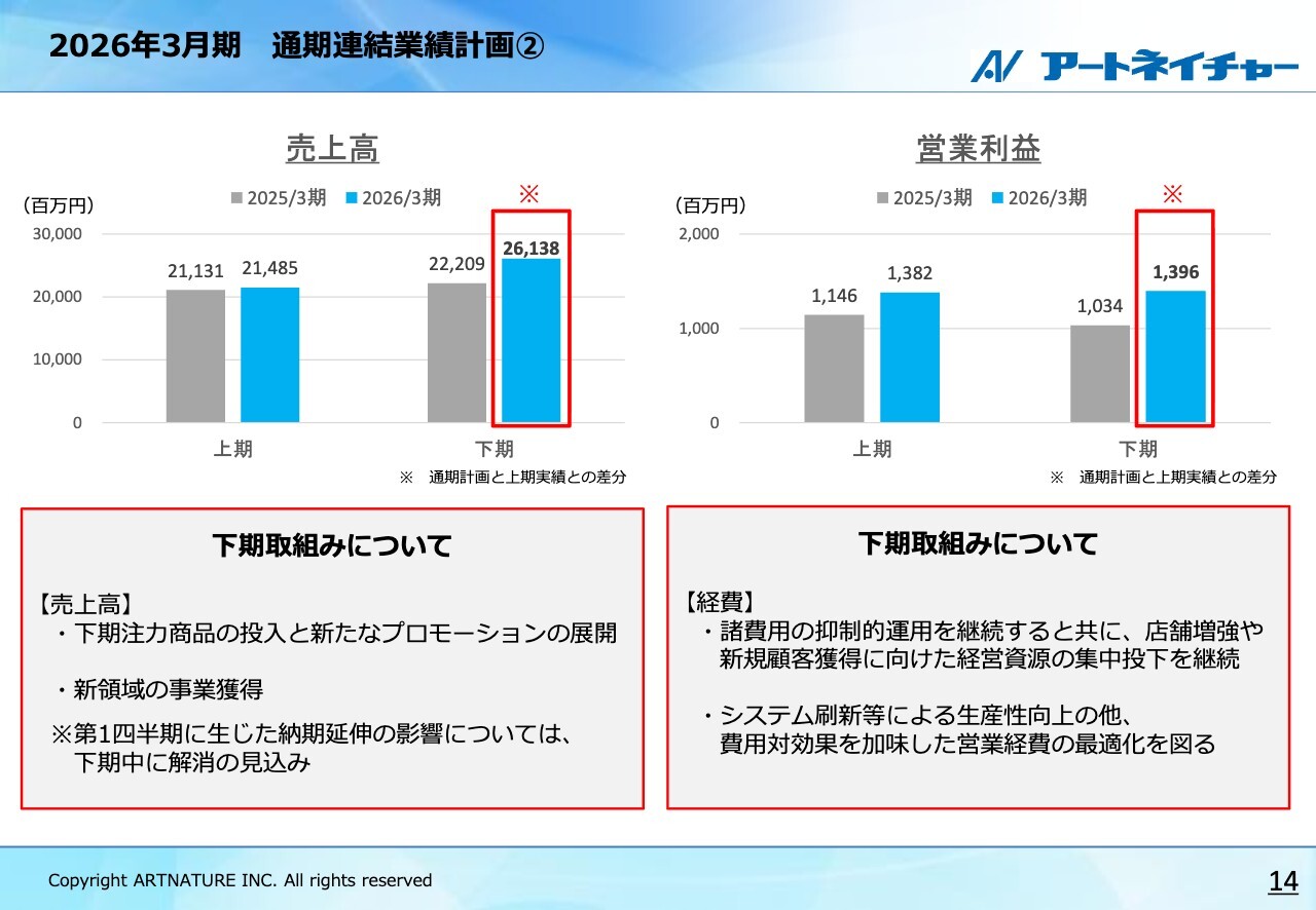 左側の売上高については、男性向けおよび女性向けの商品に重点を置き、特に秋の新商品・新プロモーションを展開しています。これをもって下期の売上を積み上げていく予定です。なお、冒頭で「納期の延伸が第1四半期に起こりました」と説明しましたが、下期には完全に解消する予定です。