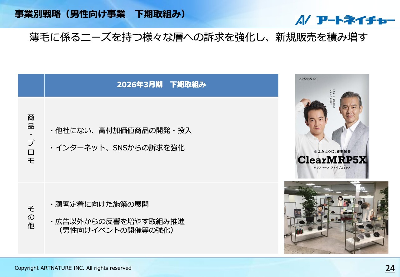 男性向け事業の下期の取り組みについてです。男性向け事業では、インターネットやSNSを活用した訴求を強化するとともに、広告以外からの反響を獲得する施策をさらに拡大します。
