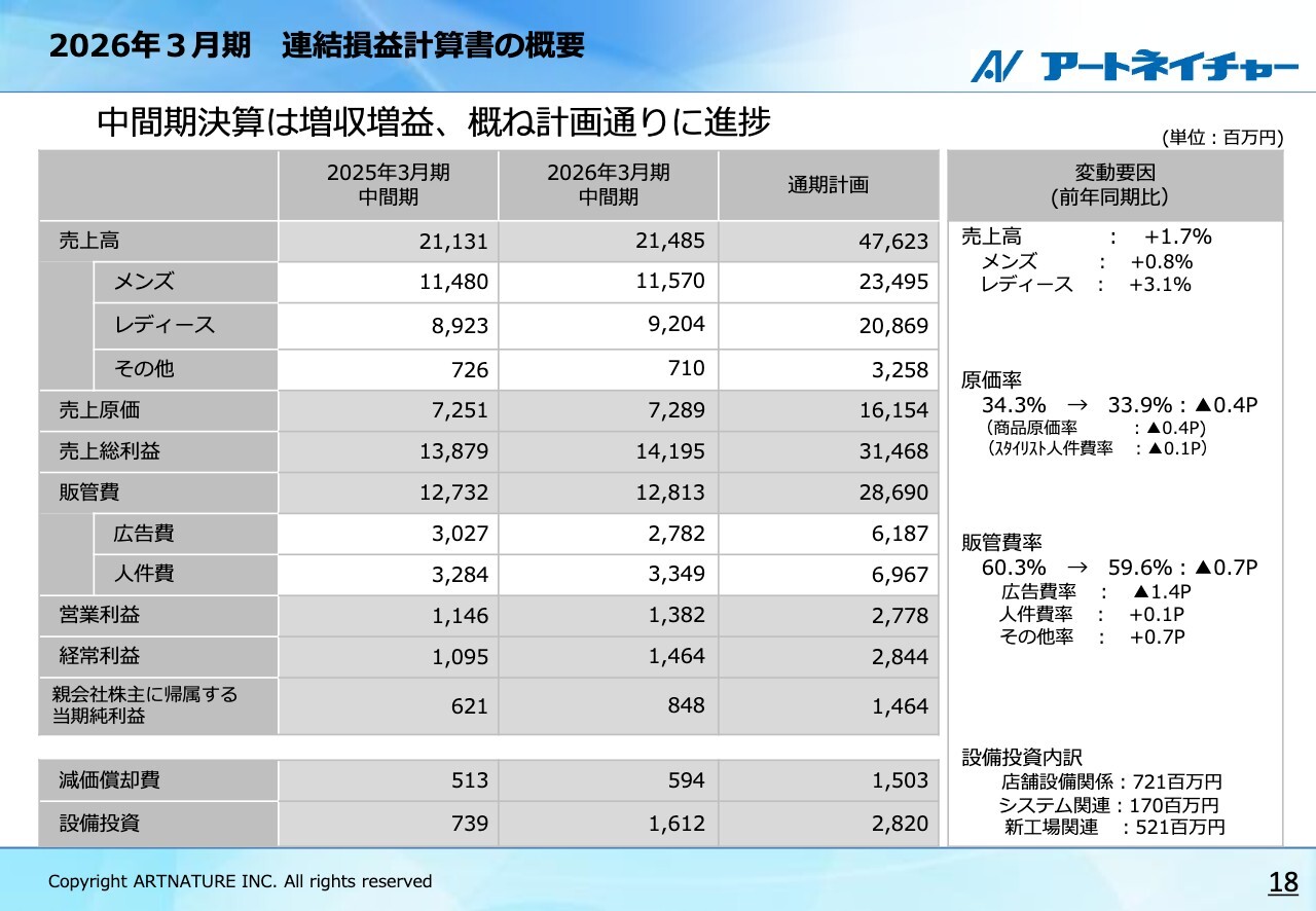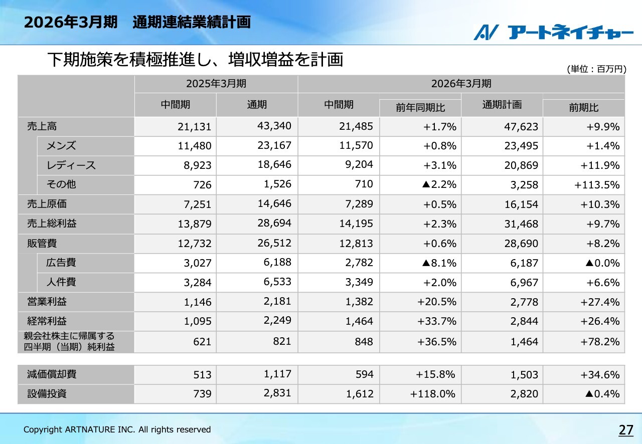 【QAあり】アートネイチャー、中間期は前年比で増収増益 メンズ部門は2期連続減収から増収へ、レディース部門は過去最高を更新