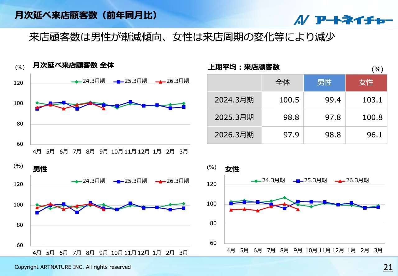 月次の延べ店舗顧客数についてです。スライド右上の表のとおり、男性向けは前年同月比98.8パーセントで漸減傾向にあり、女性向けは前年同月比96.1パーセントで前年を下回りました。