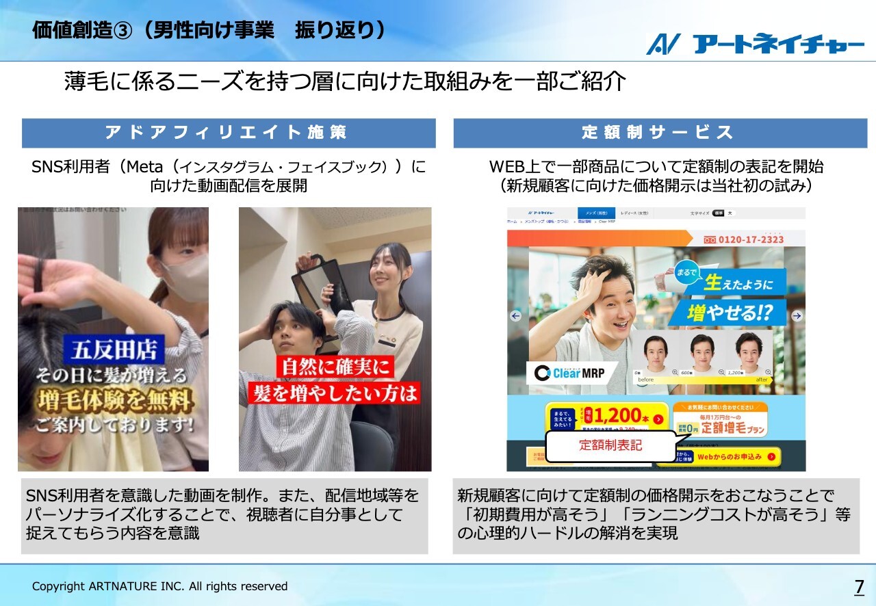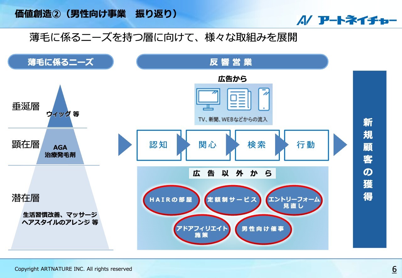 このように、薄毛に関するさまざまなお悩みに対し、アプローチの段階から消費行動に至るまで、さまざまな工程で取り組んでいます。今後もさらにこれらの取り組みをブラッシュアップし、男性向け事業の安定的な成長を目指していきたいと考えています。