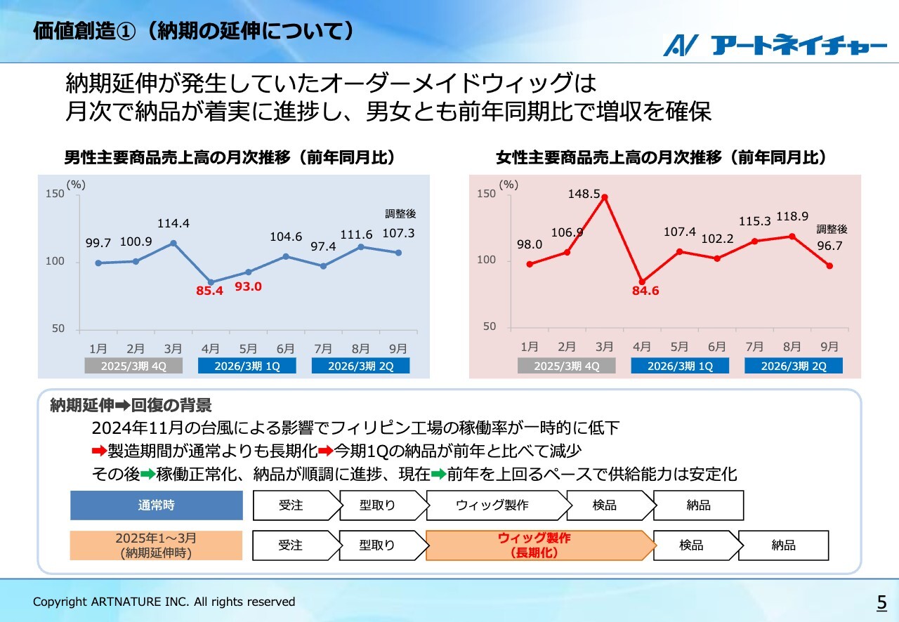 この納期の延伸により、上段のグラフに記載されているとおり、男性向け・女性向け事業ともに第1四半期の初めは前年を大きく下回る水準でのスタートとなりました。しかし、現時点では生産面はすでに通常稼働に戻り、納品も月を追うごとに順調に回復しています。最終的には、上期は増収となりました。