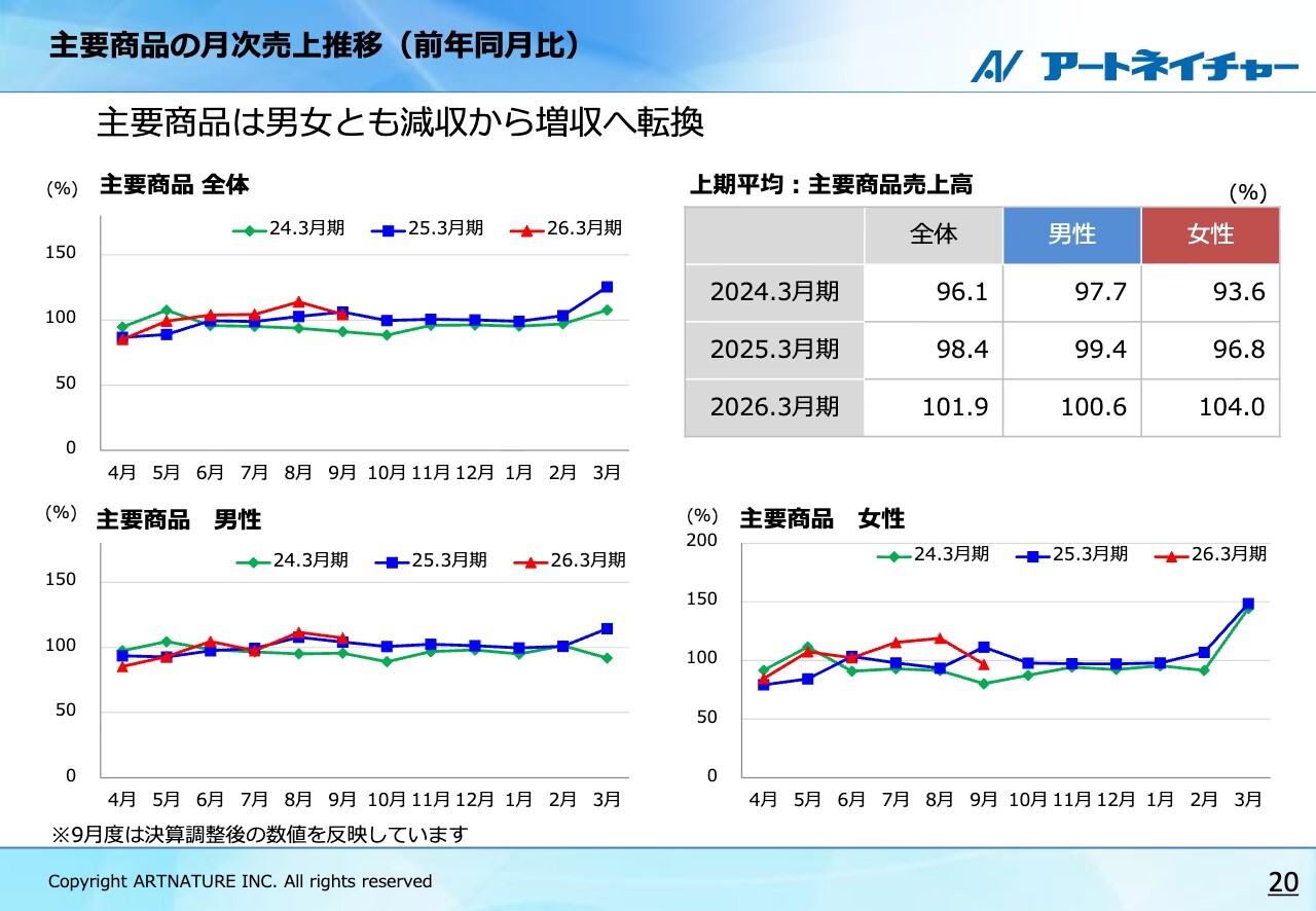 主要商品の月次売上推移についてです。スライド右上の表にあるように、男性向け女性向けとも前年を上回り、減収から増収へと転換しました。特に女性向けは前年同月比104.0パーセントと好調です。